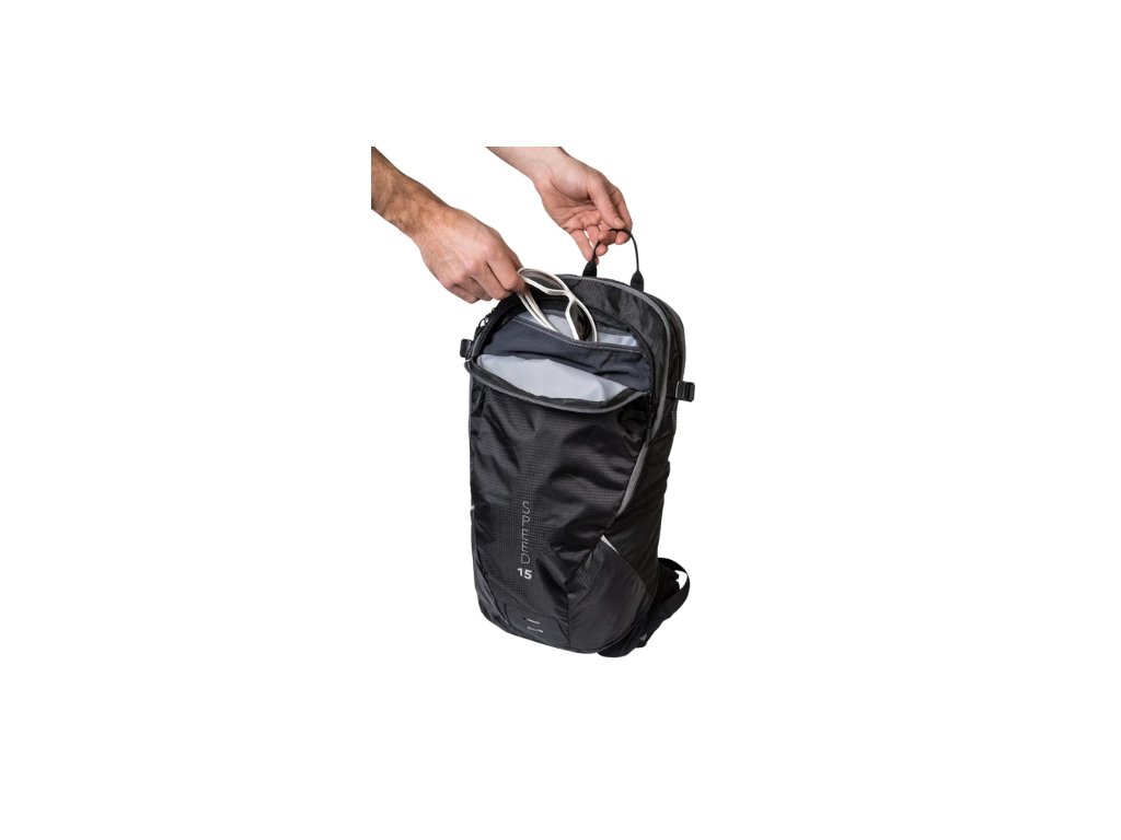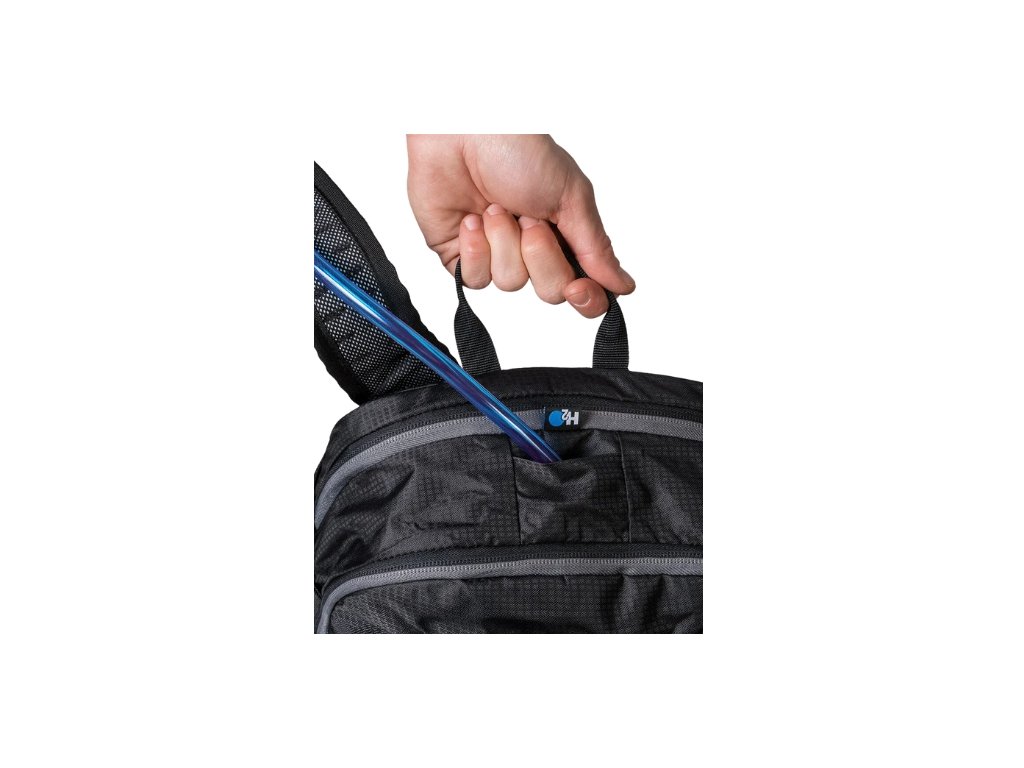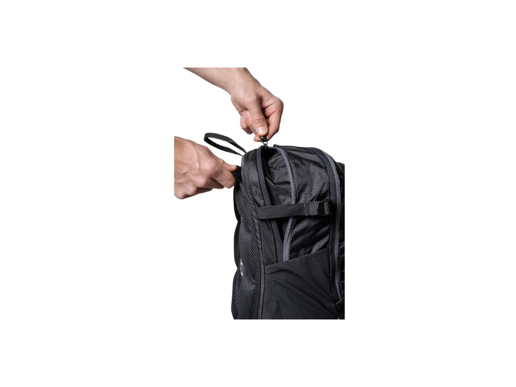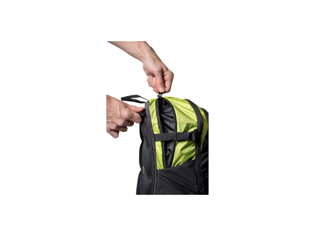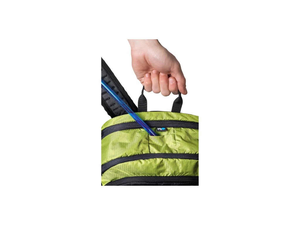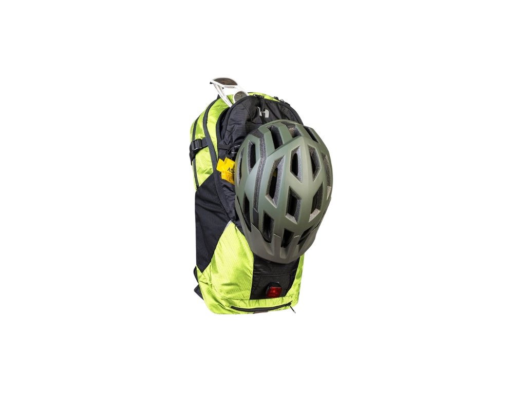 Cennosti naopak uschováte do přední či boční kapsy na zip. Batoh lze rozepnutím obvodového zipu objemově zvětšit o 3 litry. Součástí je integrovaná pláštěnka s reflexními prvky a 1l vodní vak, který je vložen do vnitřní kapsy s vývodem v horní části zad. Úchyt na blikačku a helmu oceníte během cyklovýletů.