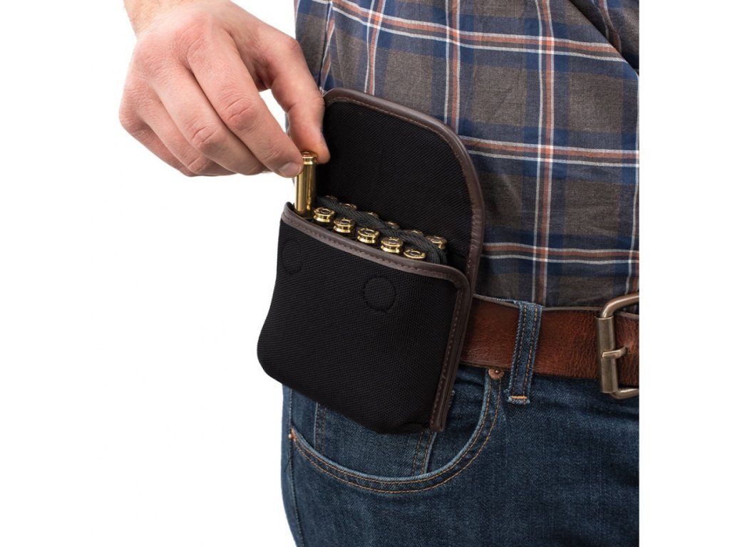 Dvoudílné pouzdro Blaser. Skládá se z vnější kapsy, která může být připevněna k opasku, a vyjímatelného elastického na 12 komponentů. Pouzdro je vyrobeno z Cordury, lemováno kvalitní kůží. Magnetický uzávěr zajišťuje rychlý a tichý přístup.