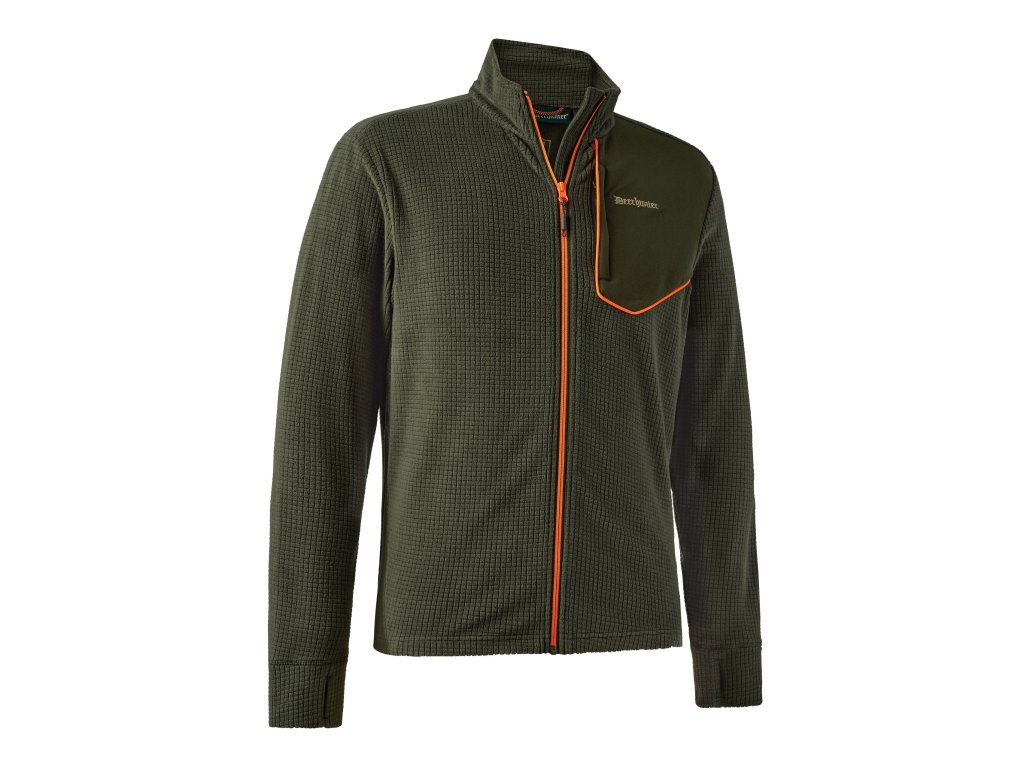 Flaušovou bundu Deerhunter Chamois Full-Zip doplňuje náprsní kapsu s manžetou a skrytým zipem.