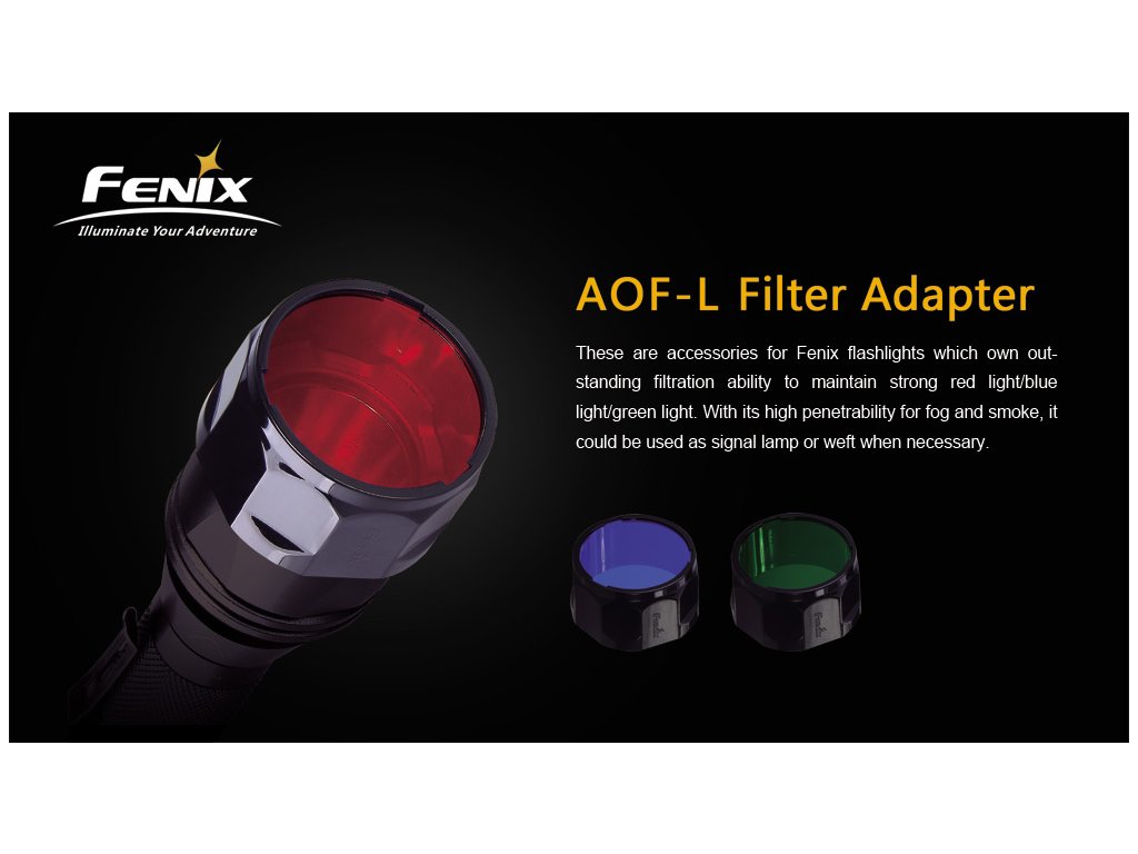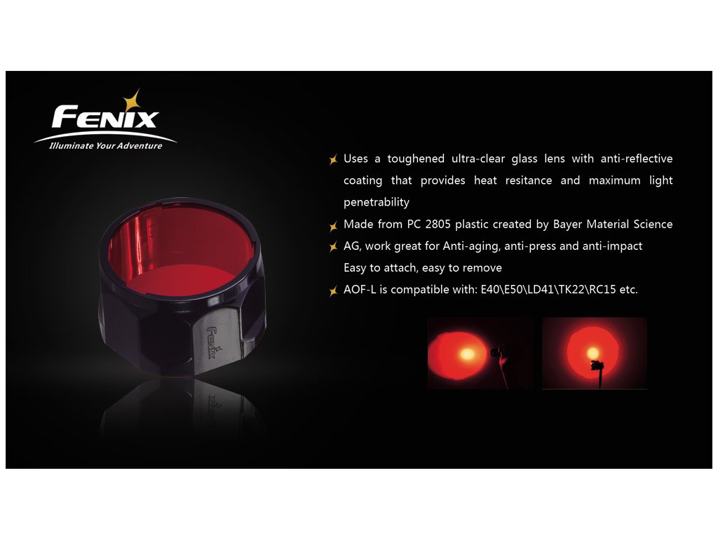 Červený filtr Fenix AOF-L pro svítidla Fenix HT30R, TK22 V2.0, TK22 UE, TK25 R&B, TK25 RED, TK25 IR, TK25 UV, TK26R, FD41 a RC20. Pasuje také na starší modely Fenix E40, E50, TK22 a RC15. Červené světlo lze použít například pro myslivost, signalizaci či v astronomii.