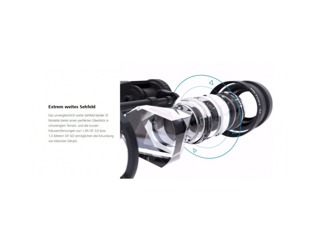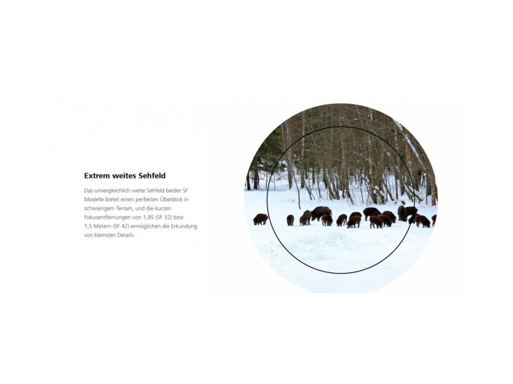 Nesrovnatelně široké zorné pole obou modelů SF nabízí dokonalý přehled v těžkém terénu a krátké zaostřovací vzdálenosti 1,95 (SF 32) a 1,5 metru (SF 42) umožňují zkoumání těch nejmenších detailů.