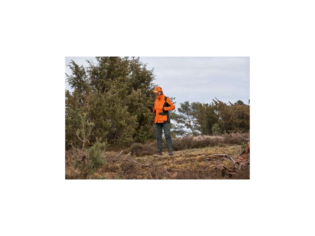 Dámská bunda pro honce Stronger je odolná vůči větru a nepromokavá, laminovaná s nepromokavými švy. Ve stojatém límci je integrovaná kapuce. Pro dobrou viditelnost při procházení je myslivecká bunda vyrobena v oranžové a zelené. Dostatečné větrání zajišťuje ventilační síťová podšívka a větrací otvory na zip pod pažemi se síťovinovou podšívkou. Dalšími prvky výbavy jsou obousměrný zip s manžetou se zapínáním na patentové knoflíky, elastický dřík a výztuhy na ramenou.