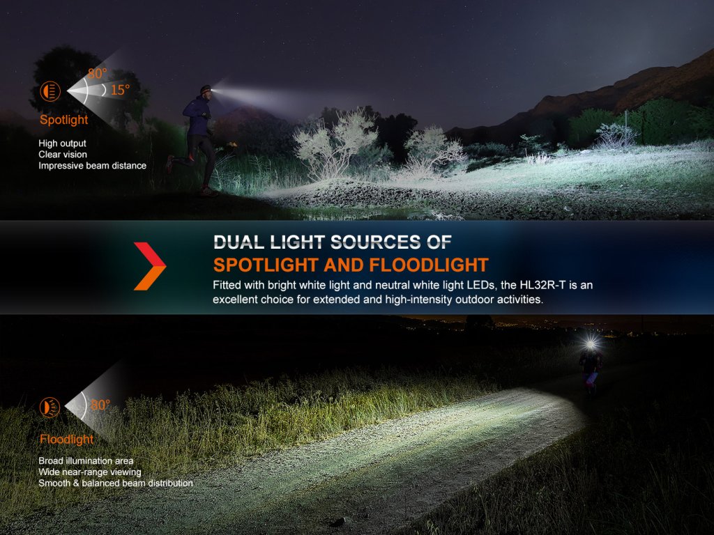 Běžecká nabíjecí čelovka Fenix HL32R-T se vyznačuje nízkou váhou a unikátní konstrukcí se dvěma reflektory . Hlavní reflektor vytváří dobře zaostřený světelný paprsek s výkonem 800 lumenů a dosvitem až 132 metrů . Druhý reflektor o výkonu 200 lumenů má světelnou stopu velmi širokou a plynulou s dosvitem 30 metrů , navíc má teplejší odstín světla (neutral white). Výhodou tohoto odstínu světla je přirozenější a kontrastnější podání barev nejen v přírodě. Ovládání obou LED je na sobě nezávislé (kužely však nelze kombinovat). K napájení slouží jeden Li-ion akumulátor ARB-LP1900 s kapacitou 1900 mAh , který je součástí balení a nabíjí se přes moderní USB-C konektor přímo v čelovce. Akumulátor lze vyjmout a v nouzi nahradit třemi běžnými bateriemi AAA (ty však nelze v čelovce nabíjet).