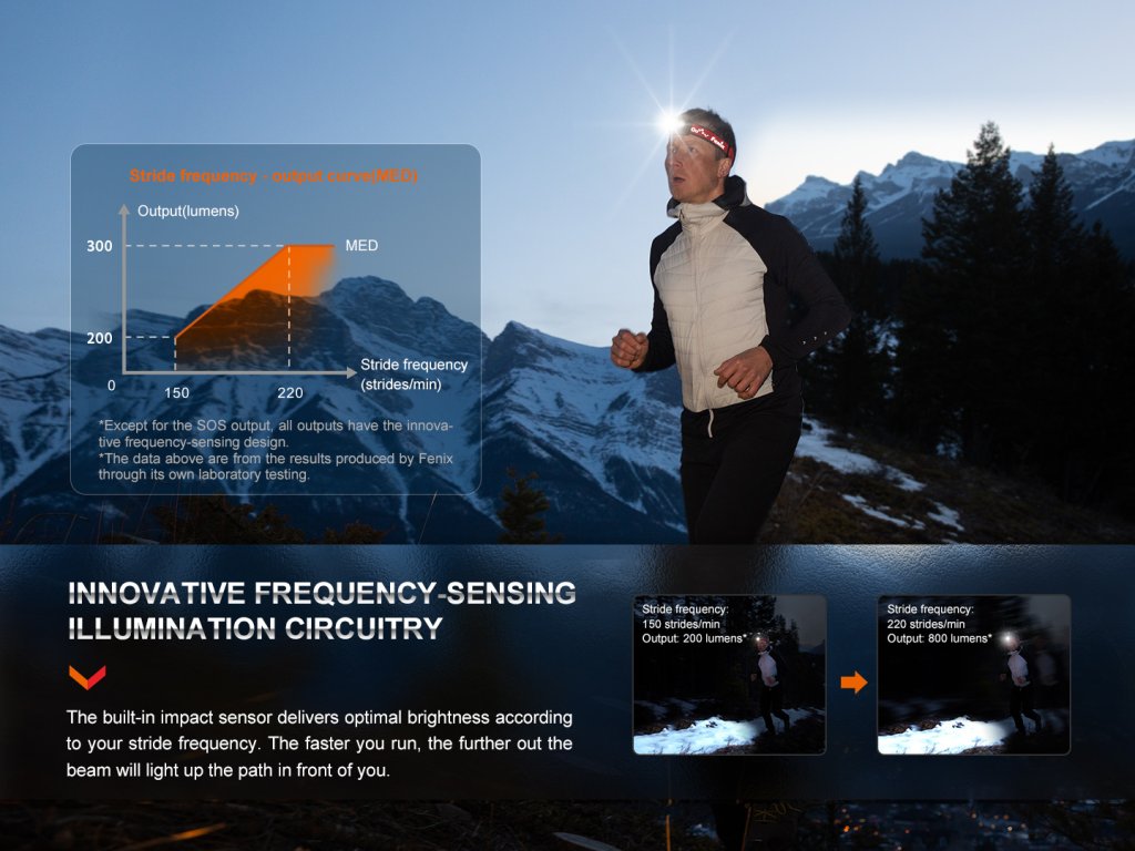 - Snímání frekvence kroků: jas se automaticky přizpůsobuje rychlosti běhu.