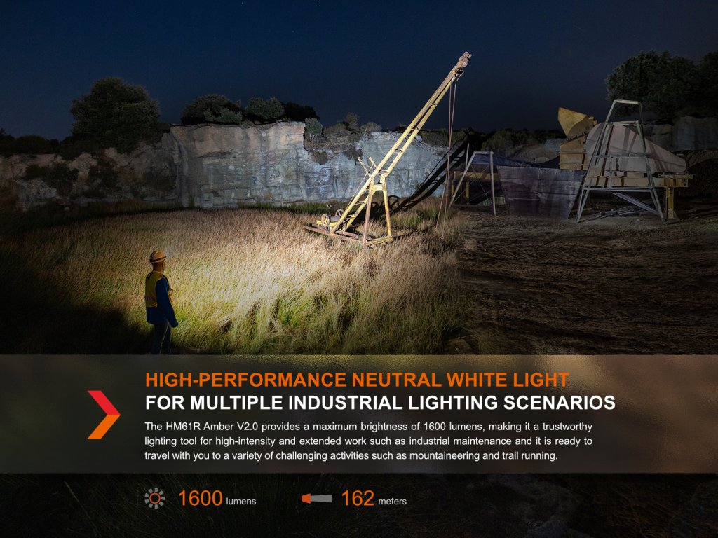 Nová generace nabíjecí čelovky Fenix HM61R Amber nabízí světelný tok až 1600 lumenů (ANSI) neutrálního bílého světla (4500 K) s dosvitem až 162 metrů. Vybavena je i červenými LED Everlight . Napájí ji jeden nabíjecí Li-ion akumulátor typu 18650 s kapacitou 3400 mAh , který se dobíjí přímo ve svítidle přes magnetický konektor , nouzově lze k napájení použít i dvě jednorázové lithiové baterie CR123A. Akumulátor má navíc zabudovaný USB-C konektor, takže jej lze snadno nabíjet i mimo čelovku bez magnetického kabelu. V ovládacím tlačítku je zabudována indikační LED , díky které budete vždy vědět, kdy akumulátor dobít. Koncovka svítidla je magnetická , takže ji lze snadno uchytit na cokoli železné. HM61R disponuje osmi režimy osvětlení, které umožňují volit mezi vysokým výkonem a dlouhou výdrží ( až 400 hodin ). Svítilna je napájena digitálně regulovaným konstantním proudem pro zaručení stálého světelného výkonu i při snižování napětí v bateriích (při jejich pozvolném vybíjení).