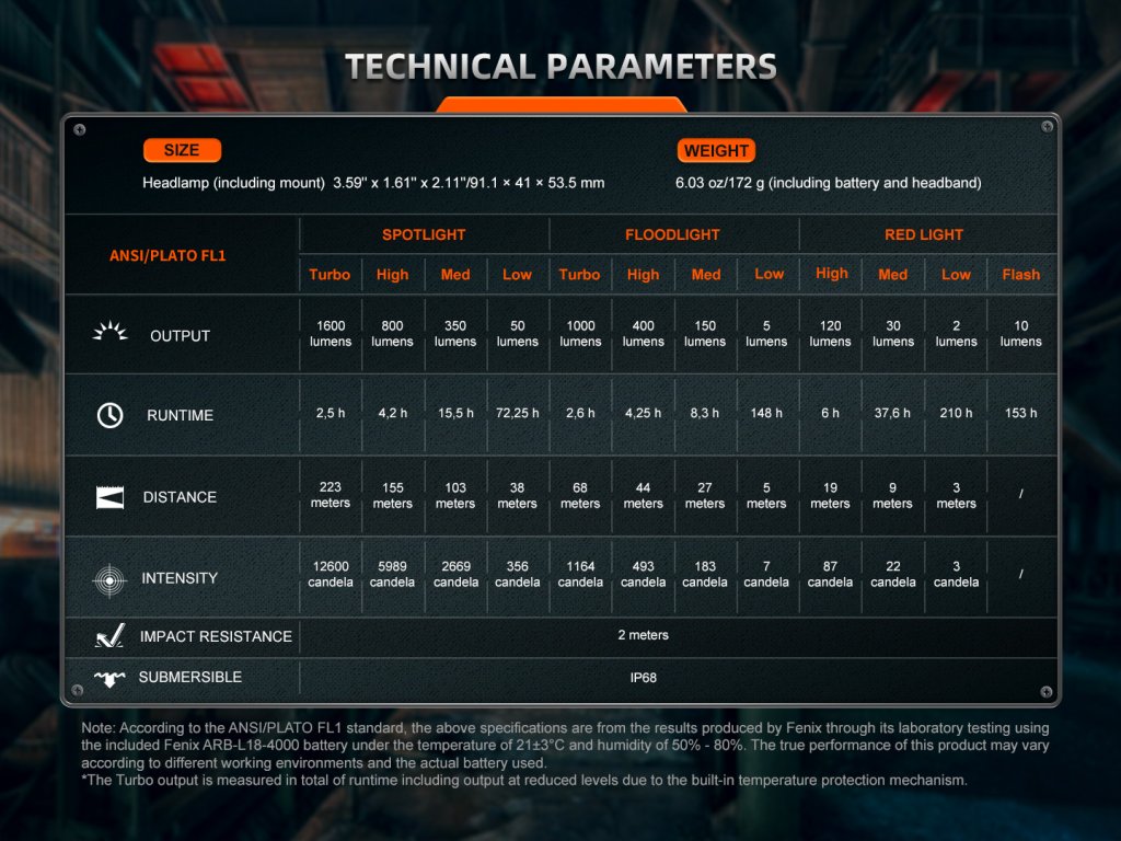 Všechny parametry čelovky (světelný tok, doba provozu na baterie, vodotěsnost, dosvit a nárazuvzdornost) jsou změřeny v souladu s normou ANSI/NEMA FL 1-2009.