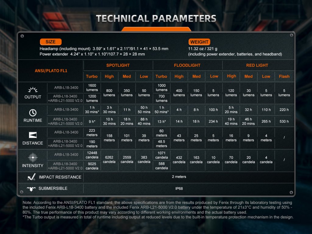 Všechny parametry čelovky (světelný tok, doba provozu na baterie, vodotěsnost, dosvit a nárazuvzdornost) jsou změřeny v souladu s normou ANSI/NEMA FL 1-2009.