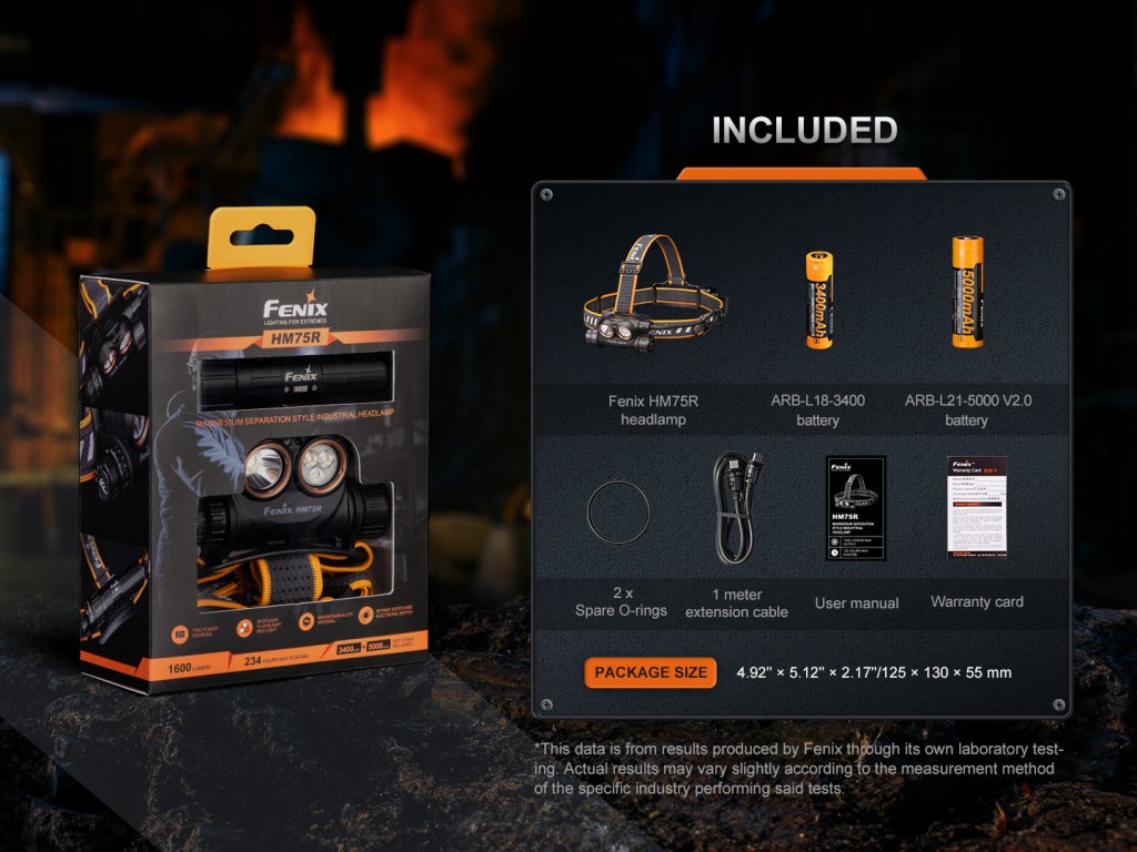 Dobíjecí čelovka Fenix HM75R disponuje dvěma světelnými kužely o výkonu až 1600 lumenů a silným červeným světlem o výkonu až 120 lumenů. Dálkový reflektor se špičkovou LED Luminus SST-40 vytváří dobře zaostřený světelný paprsek s dosvitem až 223 metrů a druhý reflektor s výkonnými LED Luminus SST-20 má světelnou stopu velmi širokou a plynulou s dosvitem do vzdálenosti 60 metrů . Světelný tok dálkového reflektoru je až 1600 lumenů , reflektor se širokým kuželem nabízí maximální výkon 1000 lumenů a neutrální odstín světla . Světlo z obou reflektorů nelze kombinovat , snadno se mezi nimi přepíná otočným voličem na boku čelovky.