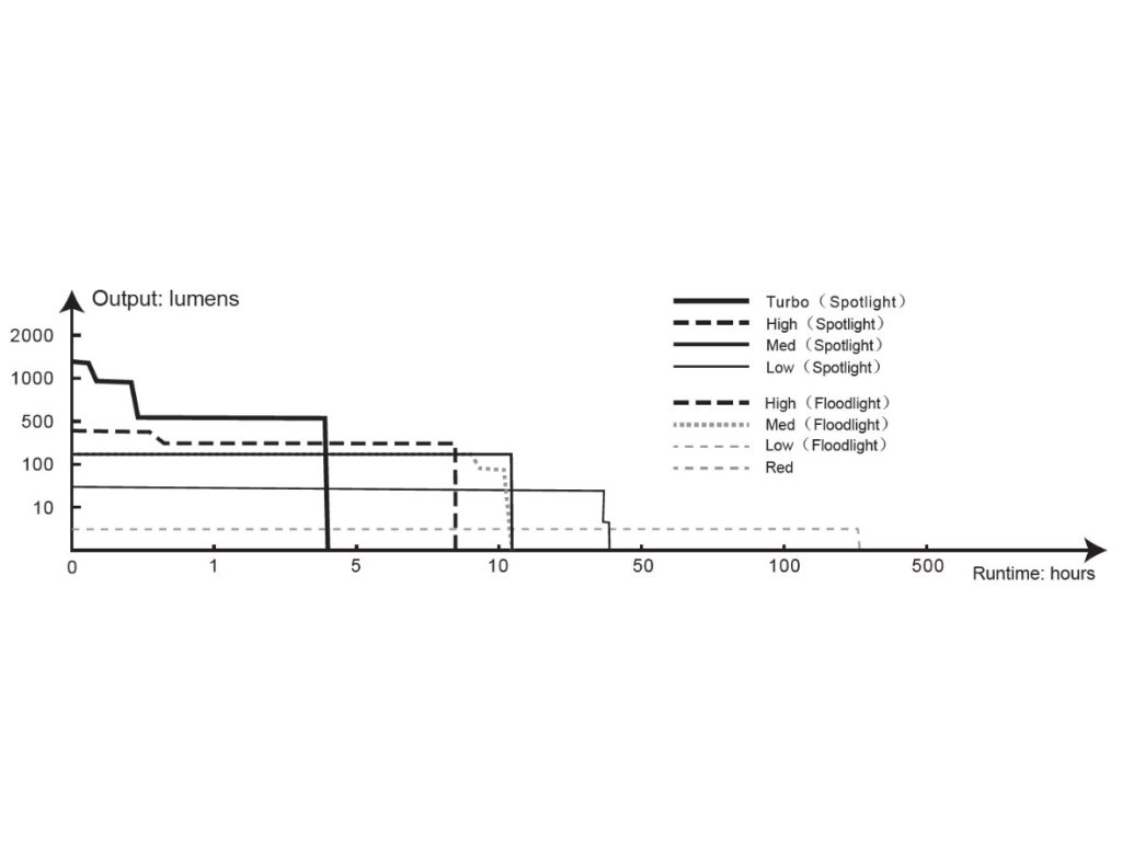 - Dálkový reflektor: 1250 lumenů (4 hodiny*) -> 400 lumenů (8 hodin*) -> 150 lumenů (12 hodin) -> 50 lumenů (36 hodin)