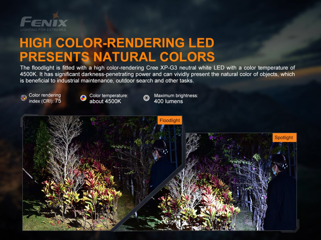 Dobíjecí čelovka Fenix HP16R disponuje celkovým výkonem až 1250 lumenů a dvěma světelnými kužely. Dálkový reflektor se špičkovou LED Luminus SST-40 vytváří dobře zaostřený světelný paprsek s dosvitem až 260 metrů a druhý reflektor s výkonnou LED Cree XP-G3 S4 má světelnou stopu velmi širokou a plynulou až do vzdálenosti 48 metrů . Světelný tok dálkového reflektoru je až 1250 lumenů , reflektor se širokým kuželem nabízí maximální výkon 400 lumenů a neutrální odstín světla . Ovládání obou LED je na sobě nezávislé, světlo z obou reflektorů lze libovolně kombinovat a dosáhnout tak krátkodobě světelného toku až 1250 lumenů . Dálkový reflektor nabízí čtyři stupně svícení a široký tři. Navíc je čelovka osazena červenou LED s výkonem 5 lumenů se signálem SOS .