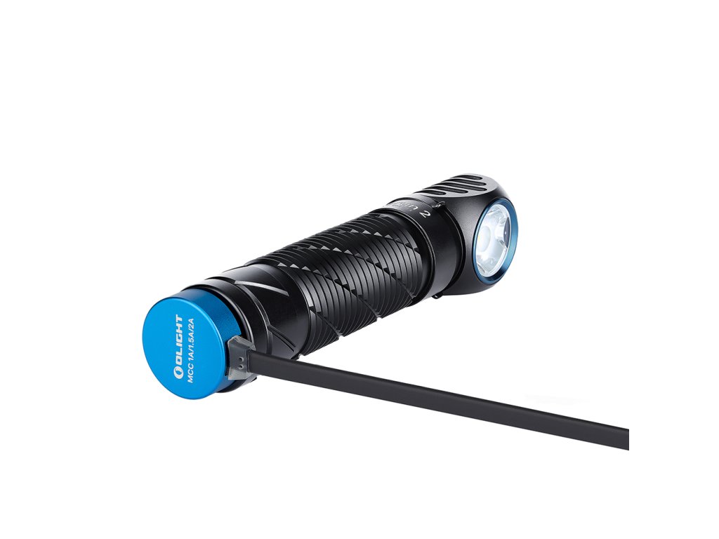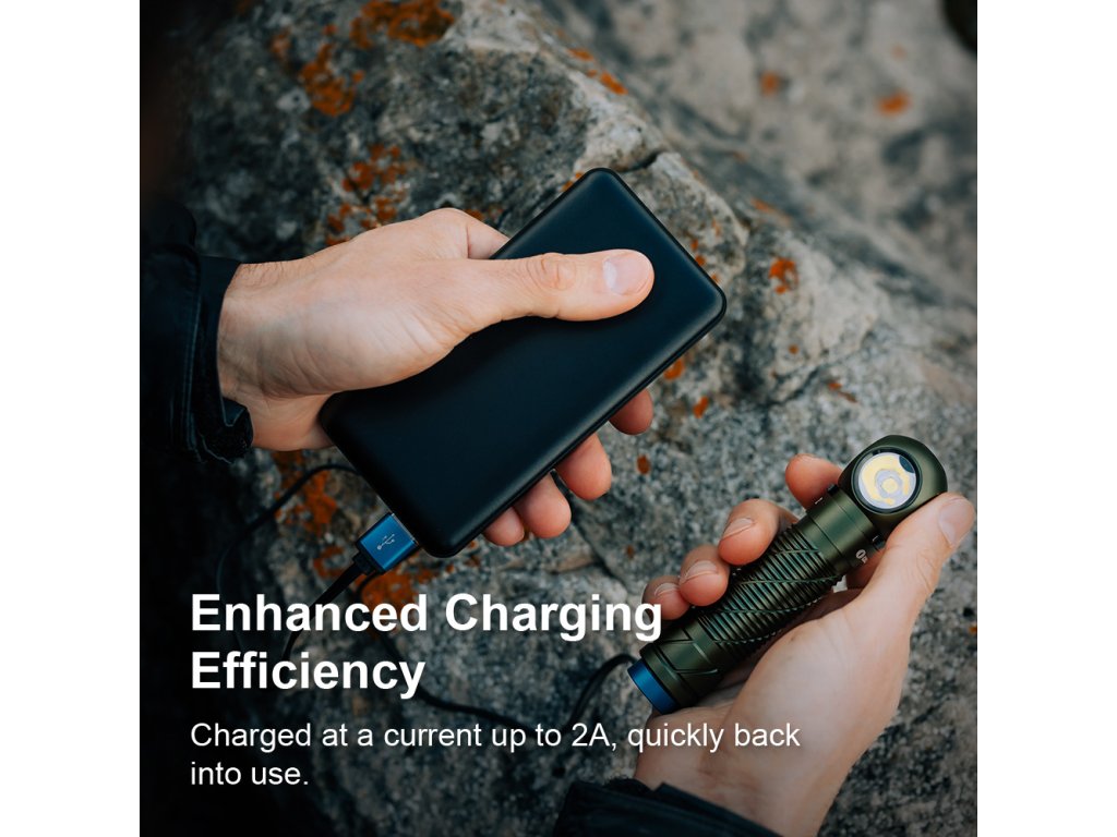 LED čelovka Perun je napájena z přiložené baterie 4000 mAh typu 21700, kterou lze nabíjet pomocí magnetické nabíječky USB Olight MCC3 1.5A USB (je součástí balení).
