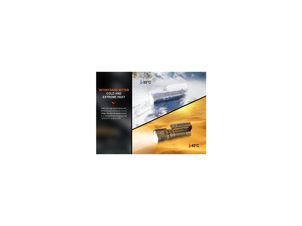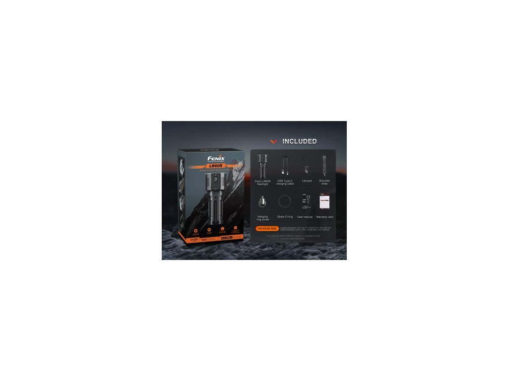 Ultra výkonná dobíjecí svítilna Fenix LR60R přináší extrémní světelný tok až 21000 lumenů a dosvit až 1085 metrů . Tento výkon dosahuje pomocí jedné prémiové LED Luminus SFT-70 a dvanácti LED Luminus SST-40 , které jsou napájeny z interního vysokoproudého Li-ion akumulátoru o kapacitě 57,6 Wh (4x 4000 mAh). Akumulátor se dobíjí přímo ve svítidle přes moderní USB-C konektor. Svítilna se ovládá otočným prstencem, kterým lze přepínat režimy ve dvou módech: vyhledávacím (až 21000 lm) a kempovém (až 15000 lm).