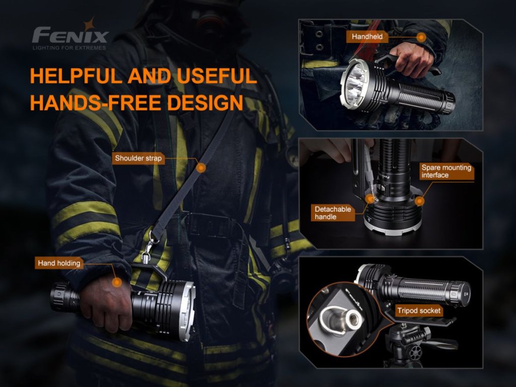 Svítilna je vybavena pěti indikačními LED , které ukazují stav nabití akumulátoru. Navíc lze svítidlo nouzově použít i jako powerbanku a nabíjet z ní další USB zařízení. Svítilna má v základním balení odnímatelné držadlo, na které lze upevnit závěsné oko a závit na stativ. Svítilnu je tak možné nosit v ruce, nebo pomocí popruhu pohodlně zavěšené přes rameno. Lze jej také upevnit na stativ a použít jako stacionární osvětlení. Toto vyhledávací svítidlo je vhodné především pro záchranné a průzkumné operace. Výborně se hodí ik hlídání velkých objektů či pro všechny nadšence do svítidel. Potěší jak profesionály, tak i ty nejnáročnější uživatele.