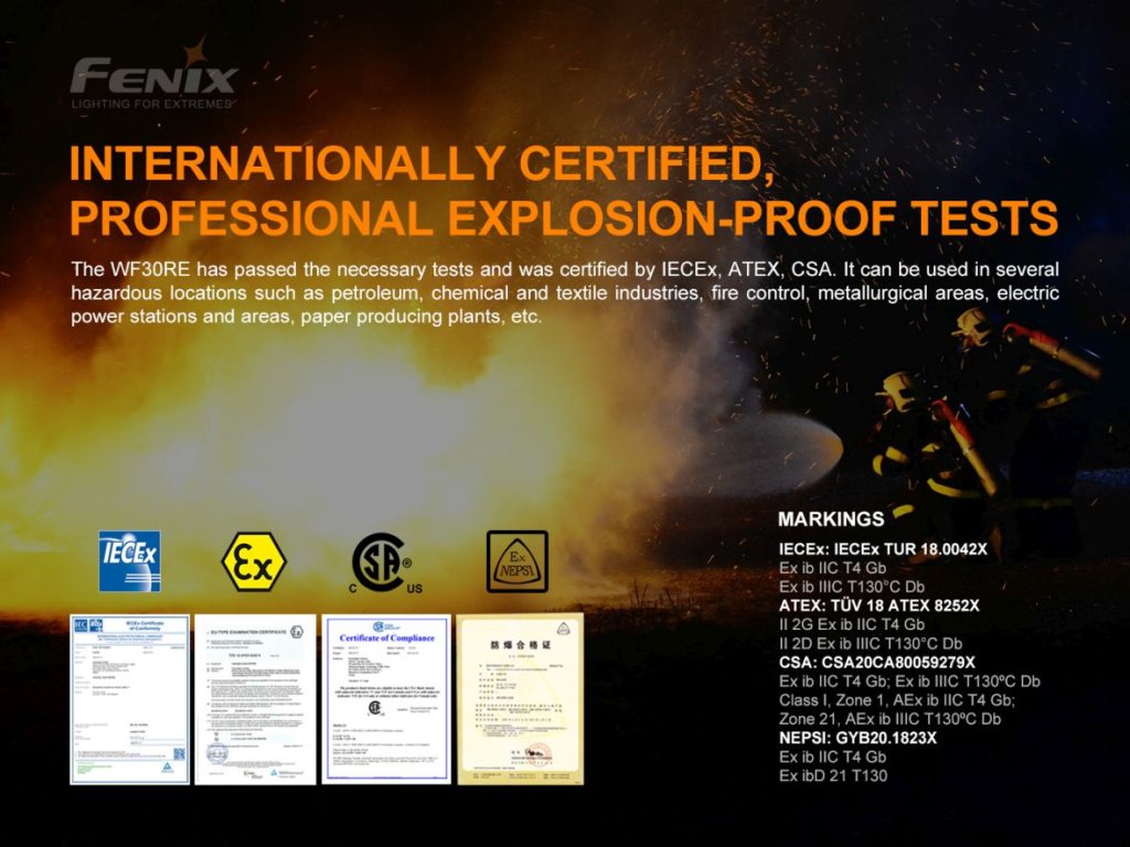Profesionální nabíjecí svítilna Fenix WF30RE s certifikací ATEX/IECex pro použití ve výbušném prostředí . Svítilna je napájena speciálně upraveným Li-ion akumulátorem ARB-L21-2600Ex s kapacitou 2600 mAh a poskytuje světelný tok až 280 lumenů s dosvitem 170 metrů . Akumulátor se dobíjí přímo ve svítidle za pomoci speciální nabíječky s bezpečnostními obvody. Tělo svítidla je vyrobeno z leteckého hliníku s vysokou odolností a nárazuvzdorností. Svítilna je určena zejména pro hasiče a záchranáře, dále je vhodná jako pracovní svítilna do průmyslových provozů s možností výskytu výbušných prachů a plynů. Jedná se například o chemické závody, rafinerie, textilky, papírny, mlýny, metalurgické provozy, elektrárny a další provozy.