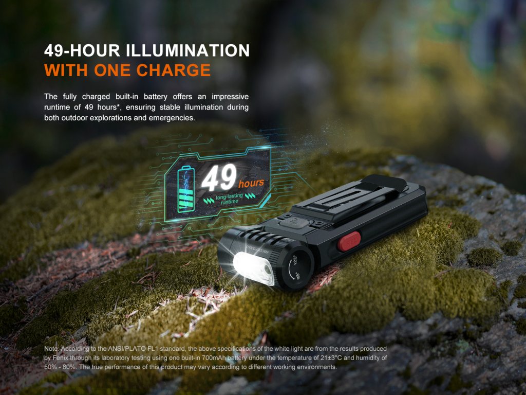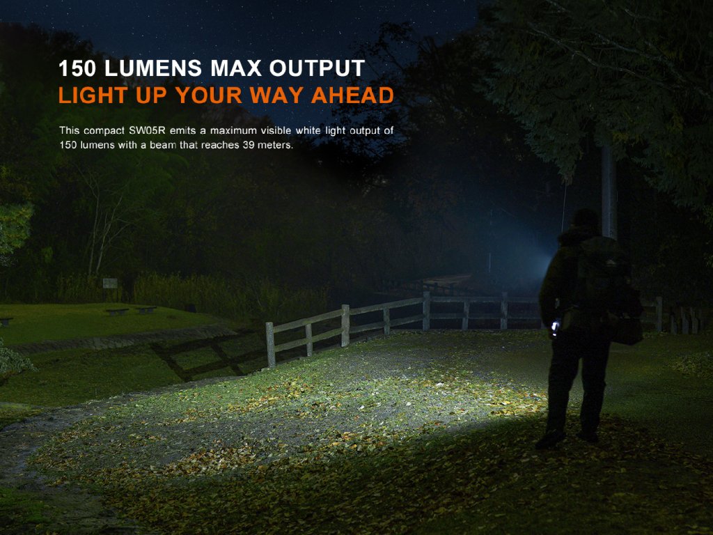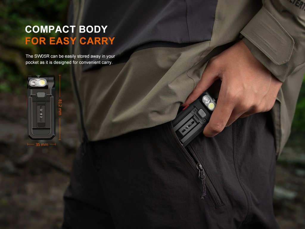 Fenix SW05R-RED je multifunkční svítidlo s otočnou hlavou, kompaktními rozměry a hmotností pouhých 55 gramů . Nabízí světelný tok až 150 lumenů (ANSI). Světelný kužel rovnoměrně osvětluje široký prostor do vzdálenosti až 39 metrů . K napájení slouží integrovaný akumulátor o kapacitě 700 mAh , který se nabíjí přes moderní USB-C konektor na boku svítidla. K dispozici jsou celkem tři režimy bílého světla a červené světlo včetně režimu blikačky. Svítilna je dodávána včetně pevného klipu , takže jej můžete uchytit na kapsu, popruh batohu či kšilt čepice a uvolnit tak při svícení ruky. Díky magnetu v patce svítidla jej můžete přichytit na cokoli železného. Hlava s diodami je otočná v rozsahu 200 stupňů . To dělá svítidlo v kombinaci s možnostmi uchycení velmi praktické . SW05R využijí zejména policisté a další profesionálové ve službě a při práci, ale skvělá je i na EDC. Díky malým rozměrům, plochému tvaru a váze jej můžete mít stále u sebe.