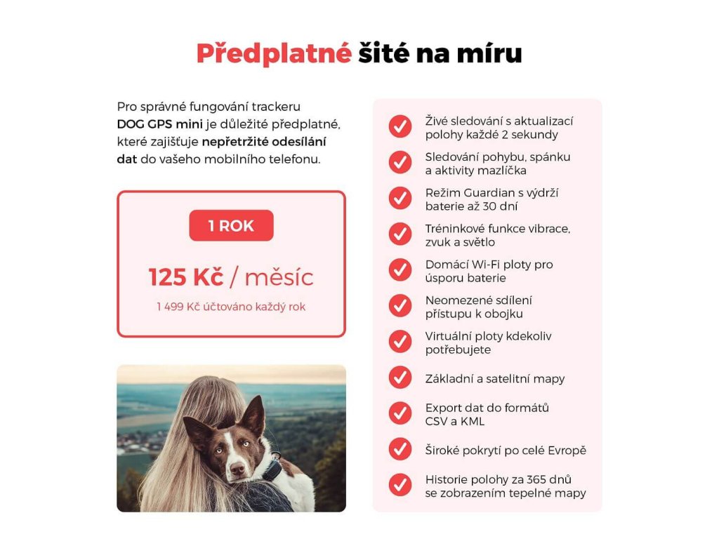 Při aktivaci lokátoru DOG GPS mini budete přesměrováni na zaplacení ročního předplatného za 59,99 € s DPH , které zajistí nepřetržité zasílání údajů o každé poloze vašeho domácího mazlíčka do aplikace Pet Tracker ve vašem mobilním telefonu. Při nákupu předplatného v obchodě App Store se cena může lišit, neboť se řídí pravidly společnosti Apple.
