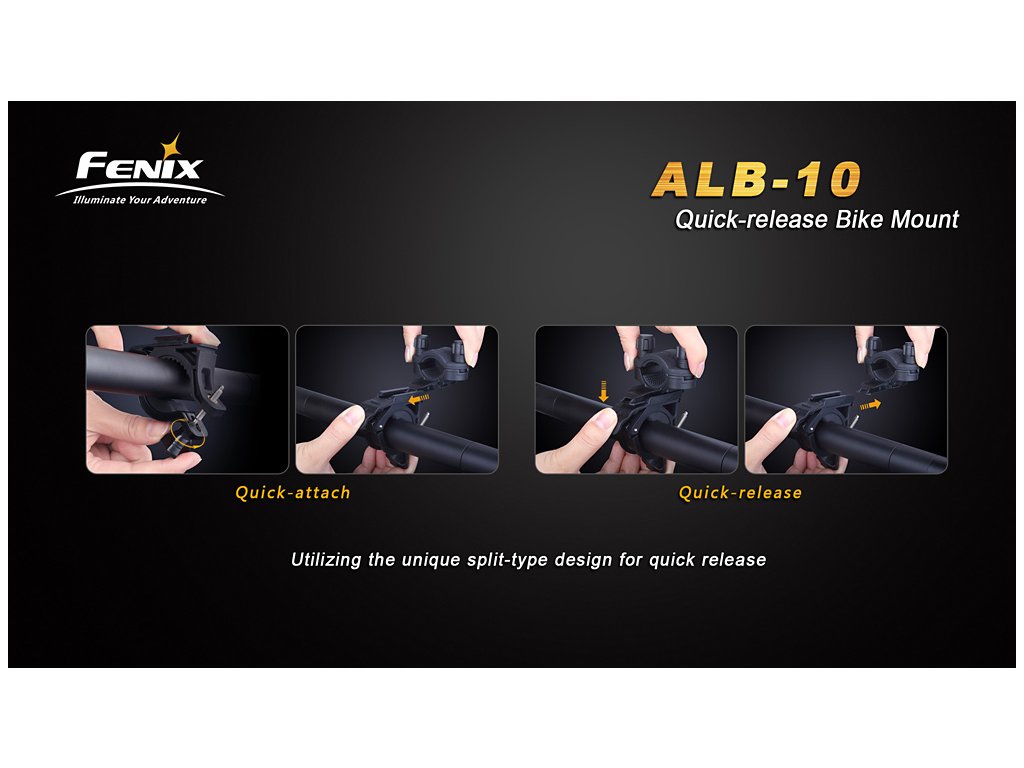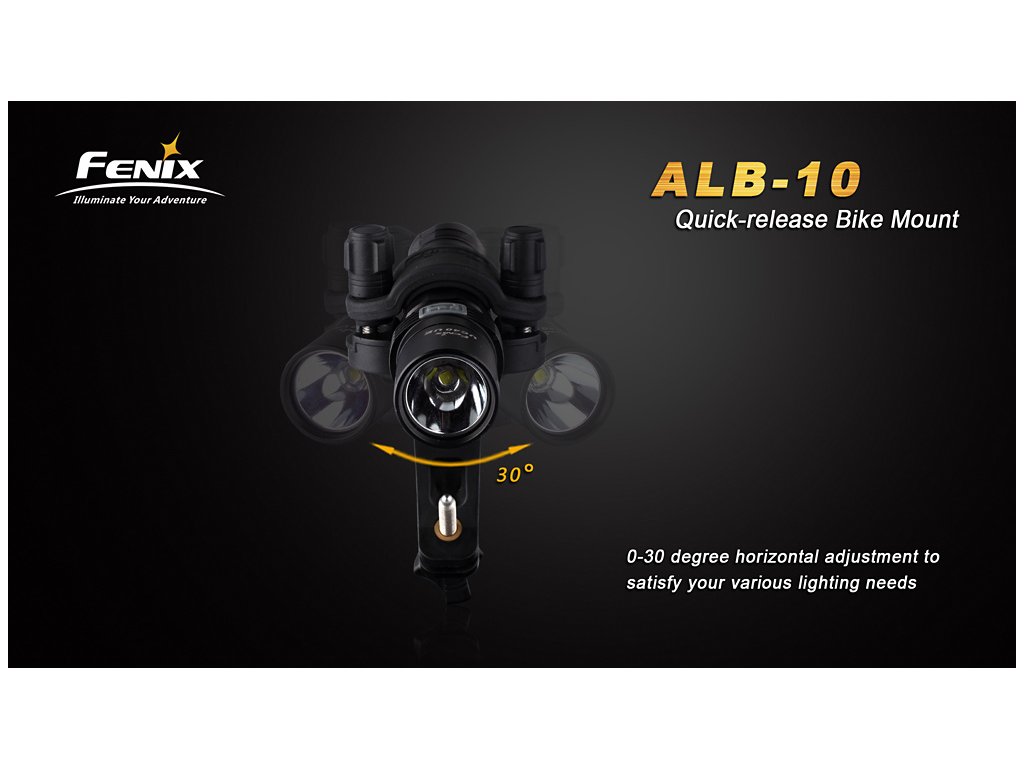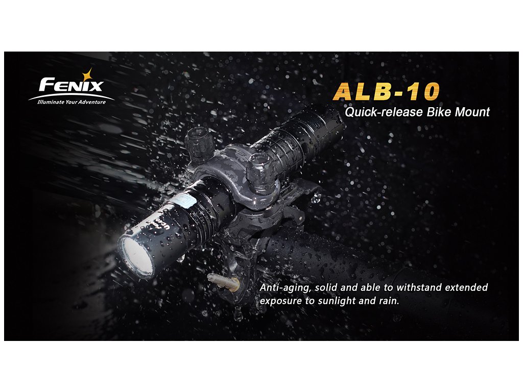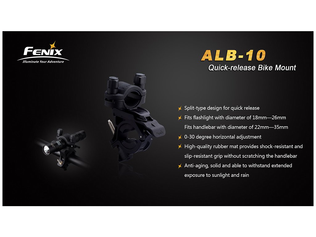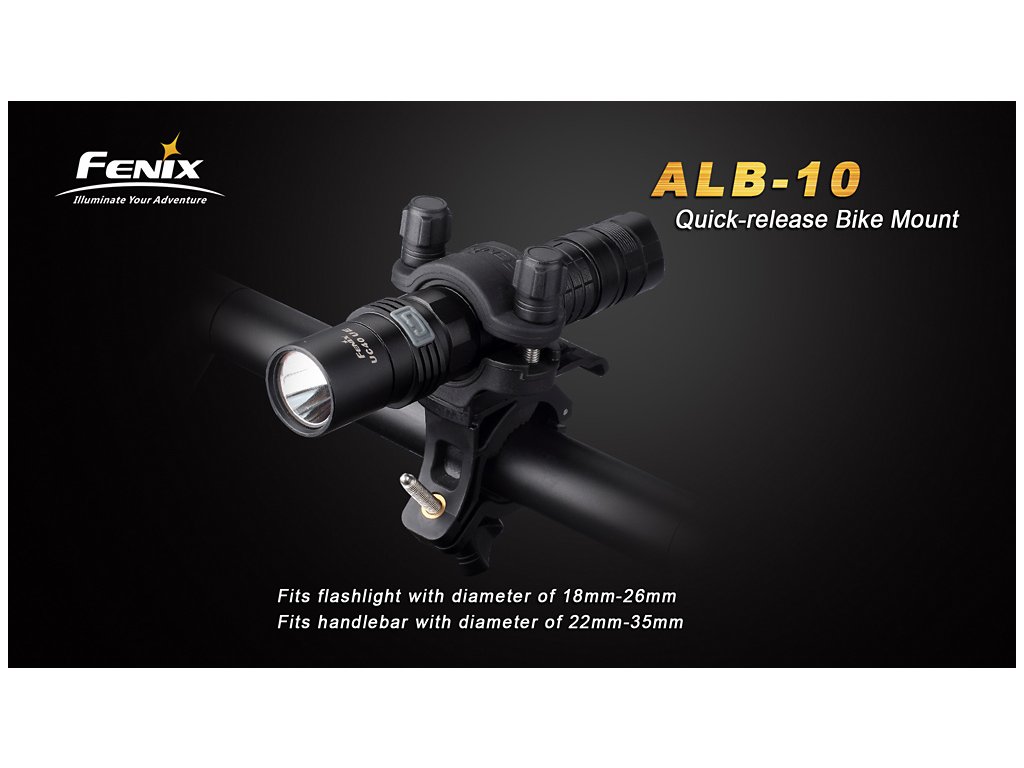Adaptér pro uchycení svítidel Fenix na kolo. Držák sestává ze dvou částí spojených rychloupínacím mechanismem, v případě potřeby tak lze světlo z kola rychle demontovat. Držák je kompatibilní s řidítky o průměru 22 - 35 milimetrů a se světly o průměru těla 18 - 26 milimetrů. Směr svícení lze nastavit v rozsahu 30°.