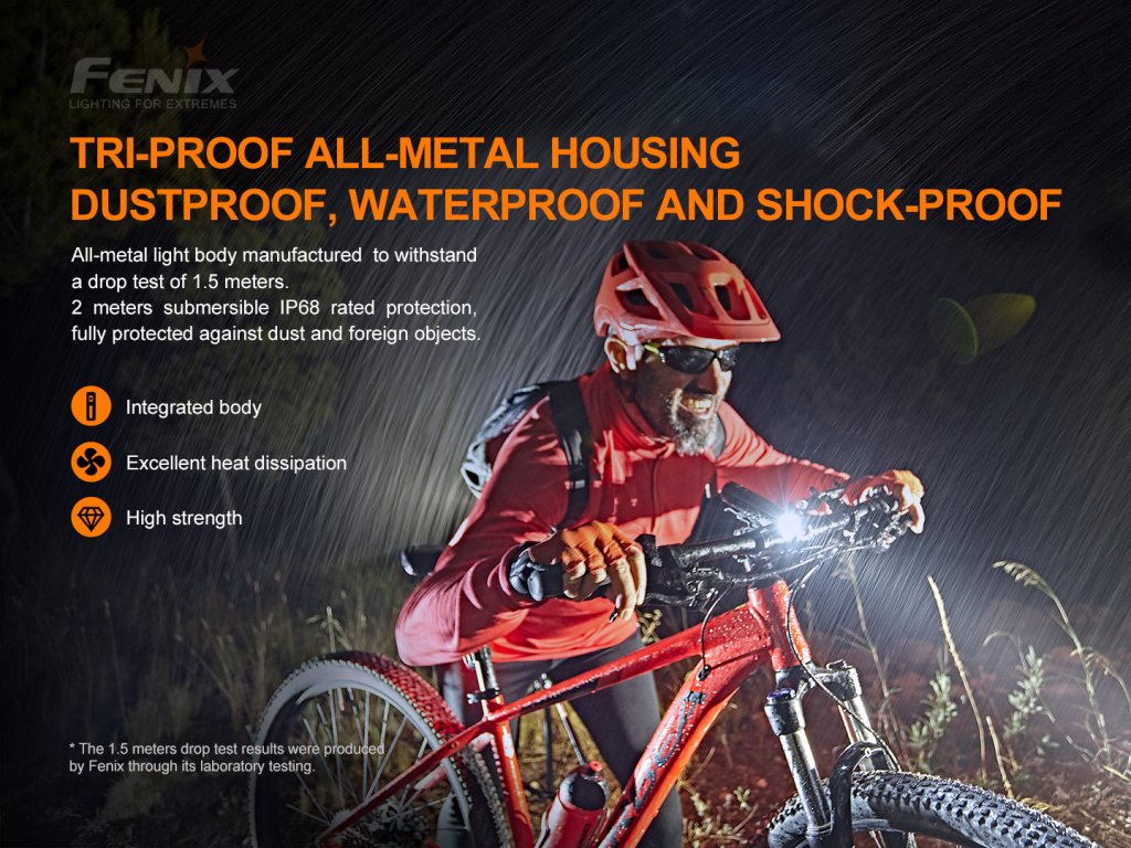 - Obsah balení: svítidlo, univerzální držák na řídítka, akumulátor Fenix 21700 s kapacitou 5000 mAh, USB-C kabel, náhradní těsnící kroužek.