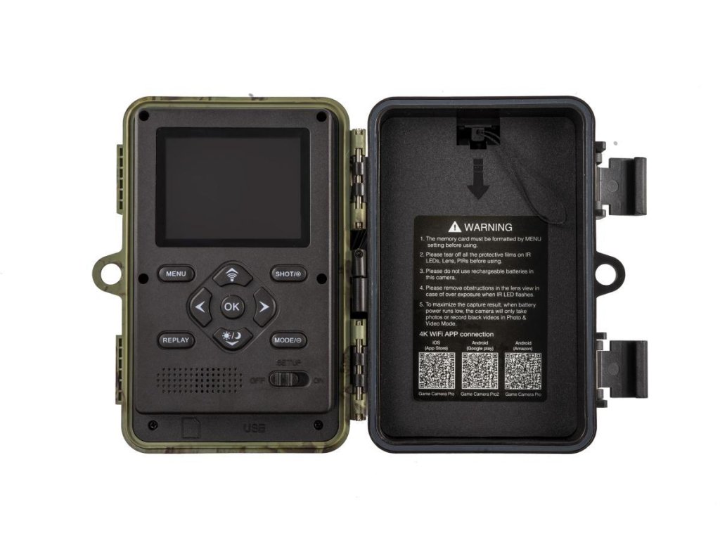Nastavení a obsluha fotopasti je velmi jednoduchá, a to především díky kompletně českého menu. Fotopast lze ovládat pomocí funkčních tlačítek, která jsou umístěna kolem velkého 2,4" LCD displeje. Další možností, jak lze s fotopastmi pracovat, je její propojení s mobilním telefonem, kde prostřednictvím mobilní aplikace můžete provádět nastavení fotopasti, pořizovat nebo prohlížet snímky, zobrazit stav nabití baterií aj.