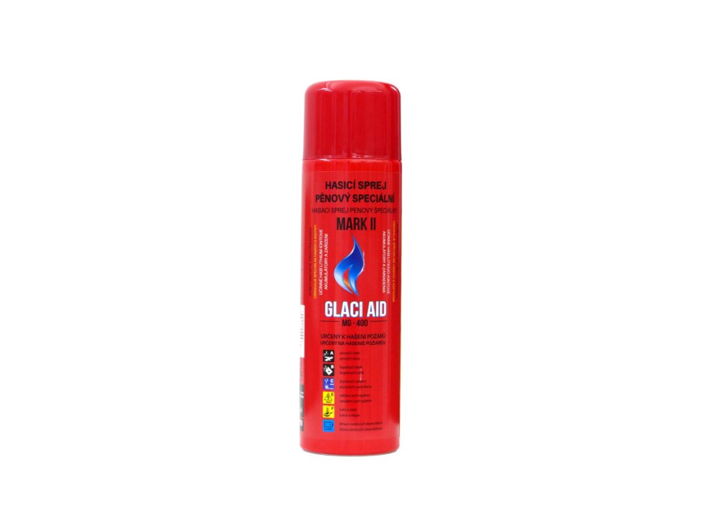 Speciální hasicí sprej GlaciAid MG-400 je opravdu univerzální a vysoce výkonný díky speciálnímu hasícímu prostředku - premixu ABF s aditivy. Sprej se zásadně odlišuje vlastnostmi a účinkem od standardních hasicích sprejů s hasivem pouze na bázi vody a pěnidla. Je určen pro bezpečnou likvidaci prakticky všech typů začínajících požárů v domácnostech, kuchyních, dílnách i dopravních prostředcích. Na rozdíl od práškových hasicích prostředků nezpůsobuje GlaciAid značné druhotné škody, pouze mírné znečištění v místě aplikace. Verze Mark 2 je navíc účinná při hašení lithium-iontových akumulátorů a baterií , při zachování všech hasicích schopností a výjimečných vlastností první generace. Použité hasivo zabraňuje znovuvznícení hořlavin po aplikaci, což je výhoda zejména při laickém použití běžnými uživateli.