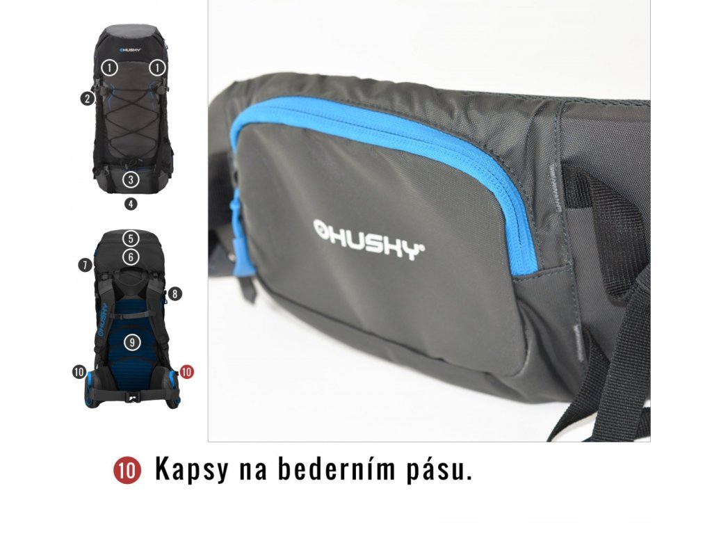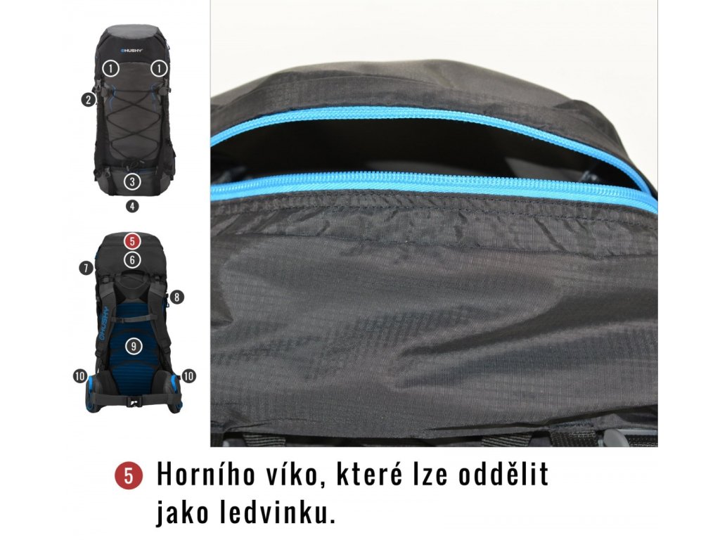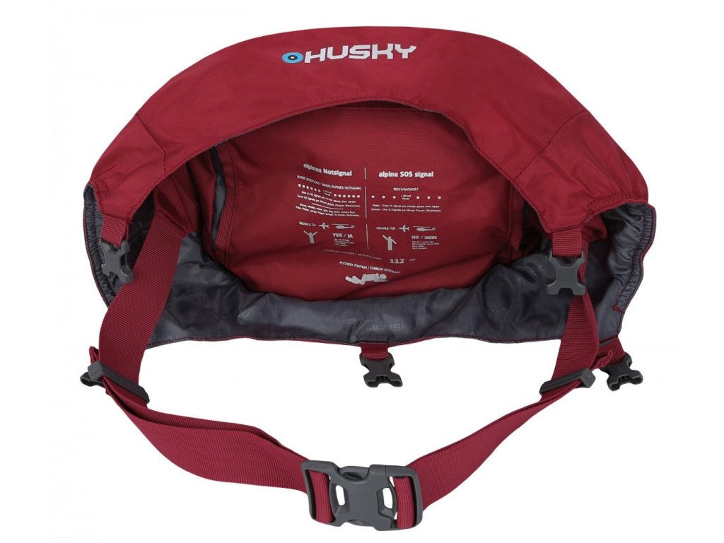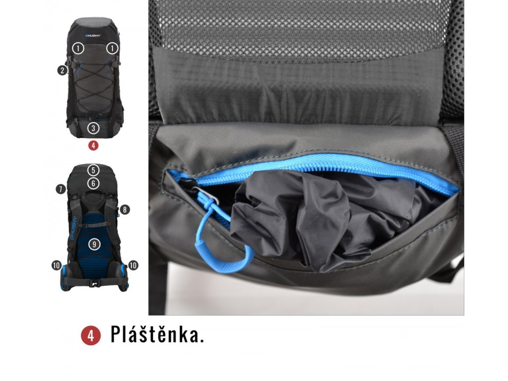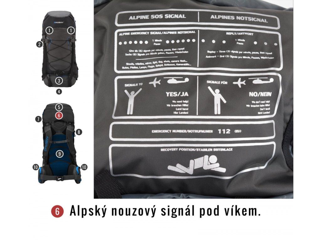 Odnímatelné víko, hrudní popruh, bederní pás, pláštěnka, emergency symbols.