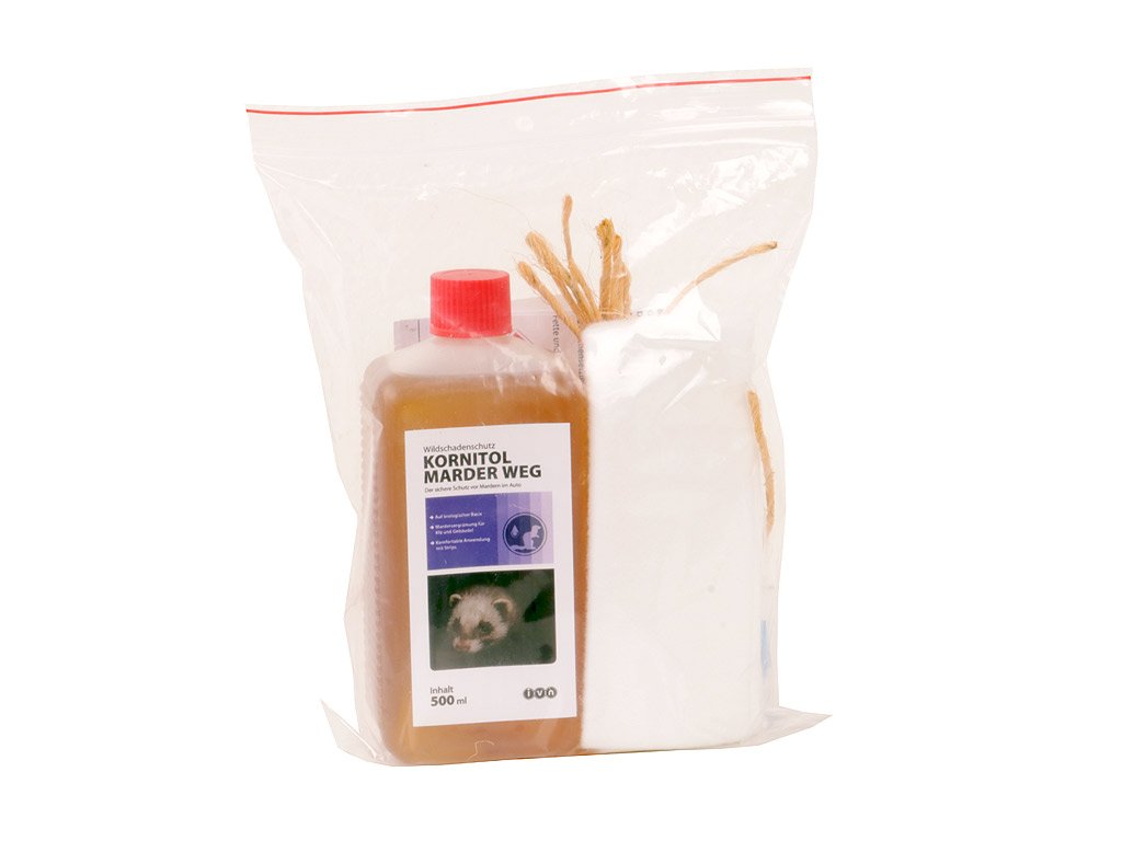 Odpuzovač kun KORNITOL Marder Weg je jeden z nejúčinnějších pachových odpuzovačů na kuny. Tento produkt má velmi intenzivní a specifický zápach, který se v praxi osvědčil již mnoho let. Udržujte kuny mimo vaše vozidlo, domov a chat s odpuzovačem KORNITOL Marder . Odpuzovač kun KORNITOL Marder je dodáván se 6 speciálními proužky, 6 přidržovacími dráty a 1 párem ochranných rukavic. Pro účinnost přípravku obvykle postačuje maximálně 20 aplikací a kuna okamžitě opouští chráněný prostor. Doporučuje se neaplikovat přípravek přímo k vzduchové ventilaci vozidla ani do blízkosti obydlených pokojů. Odpuzovač kun KORNITOL Marder je extrémně účinný a zaručí vám, že kuny odejdou a dají vašemu obydlí klid.