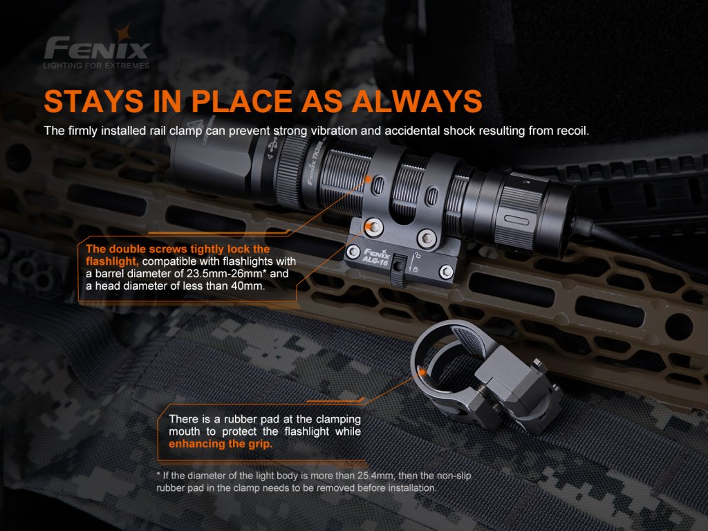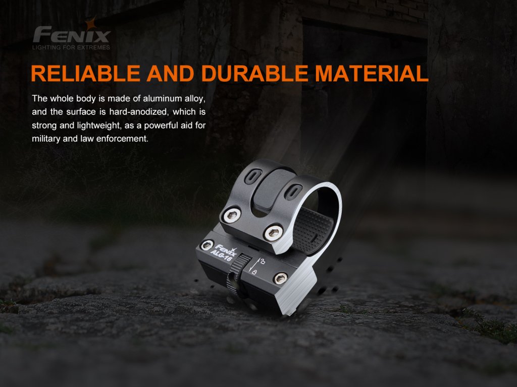 Kovová montáž Fenix ALG-16 umožňuje připevnit svítidlo na rozhraní M-LOK (Magpul Lock). Je kompatibilní se svítidly o průměru těla 23,5 - 26,0 milimetrů a průměru hlavy do 40 milimetrů. Vhodná například pro svítidla Fenix TK11 TAC, TK16 V2.0, TK22 V2.0, TK22 UE, TK22 TAC, TK25 IR, TK25 R&B, TK25 Red, TK25 UV, TK26R , PD32 , PD35, PD3 UC35, FD41. Montáž ALG-16 lze na M-LOK upevnit rychle pomocí otočného kolečka. Svítidla PD35 V3.0 a PD35R lze do této montáže vzhledem k menšímu průměru těla upnout pouze za hlavu nebo koncovku.