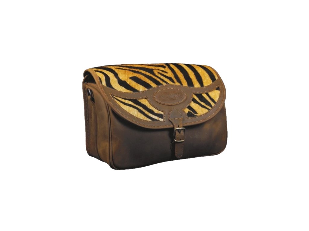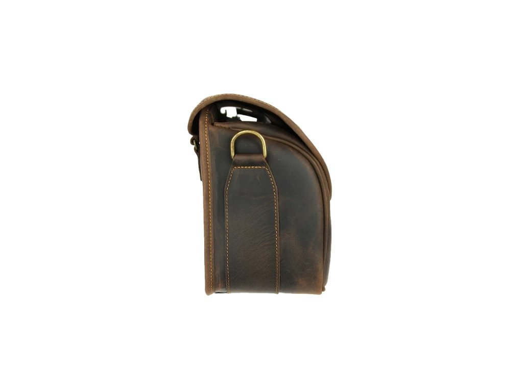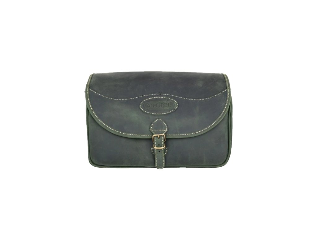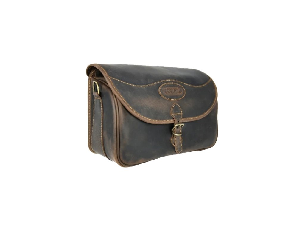 Myslivecká taška s voděodolnou úpravou, pevně ušitá, janovský typ. Má kapacitu 100 nebalených komponentů kálib. 12. Obsahuje kožený ramenní popruh.