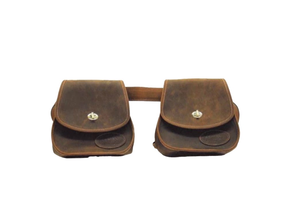 Taška s voděodolnou úpravou, ručně dokončená, do detailů vypracovaná, pevně ušitá, prodávaná v páru, s efektem telecí uzavřená speciálním zámkem. Každá s kapacitou 60 nebalených mysliveckých komponentů kálib. 12.
