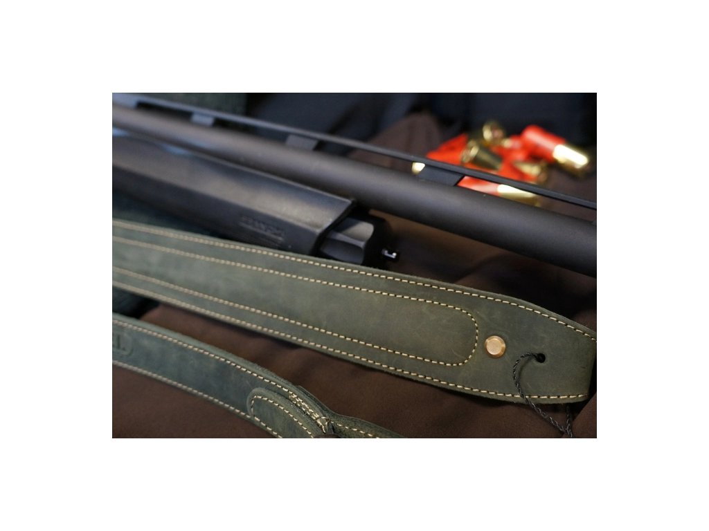 Řemen s fektem telecí nebo v zelené kůži s voděodolnou úpravou a vycpávkou, ručně dokončen. Je kompletně podšit neklouzavým velurem. Ne přezka, ale šrouby a otvory pro perfektní přizpůsobení tělu.