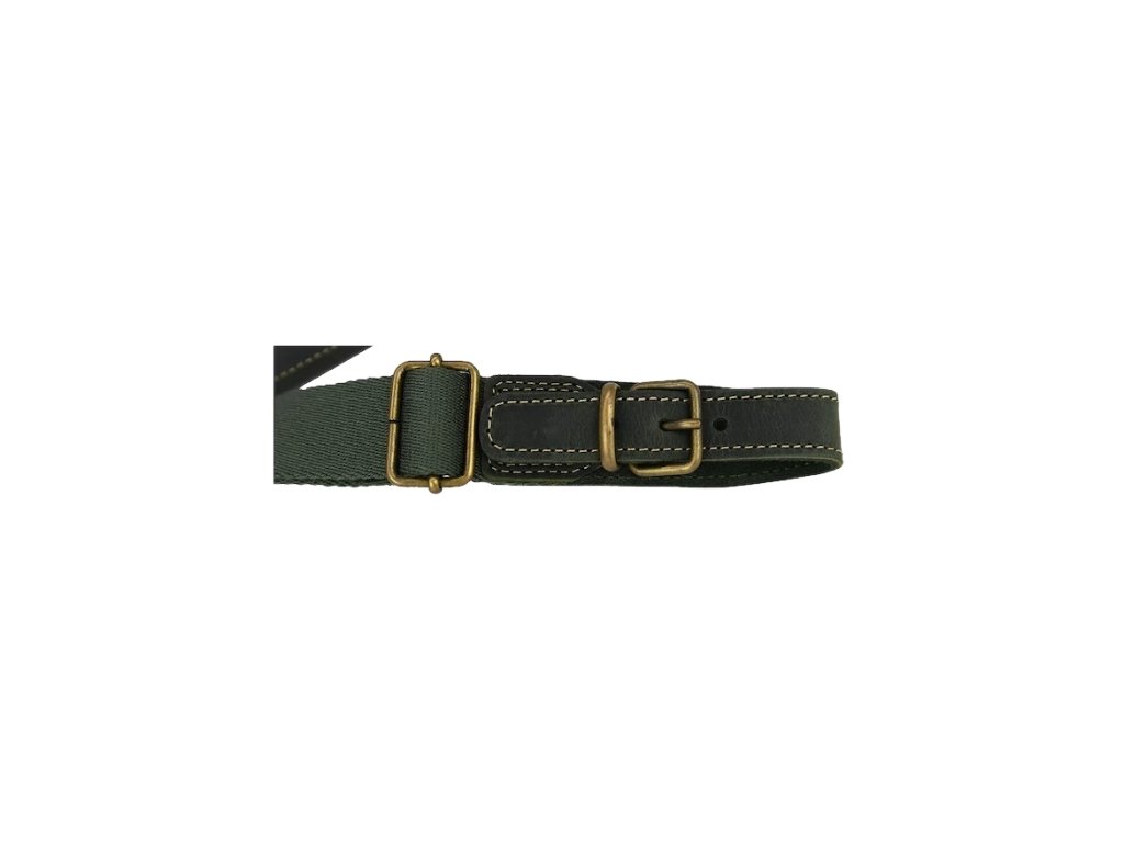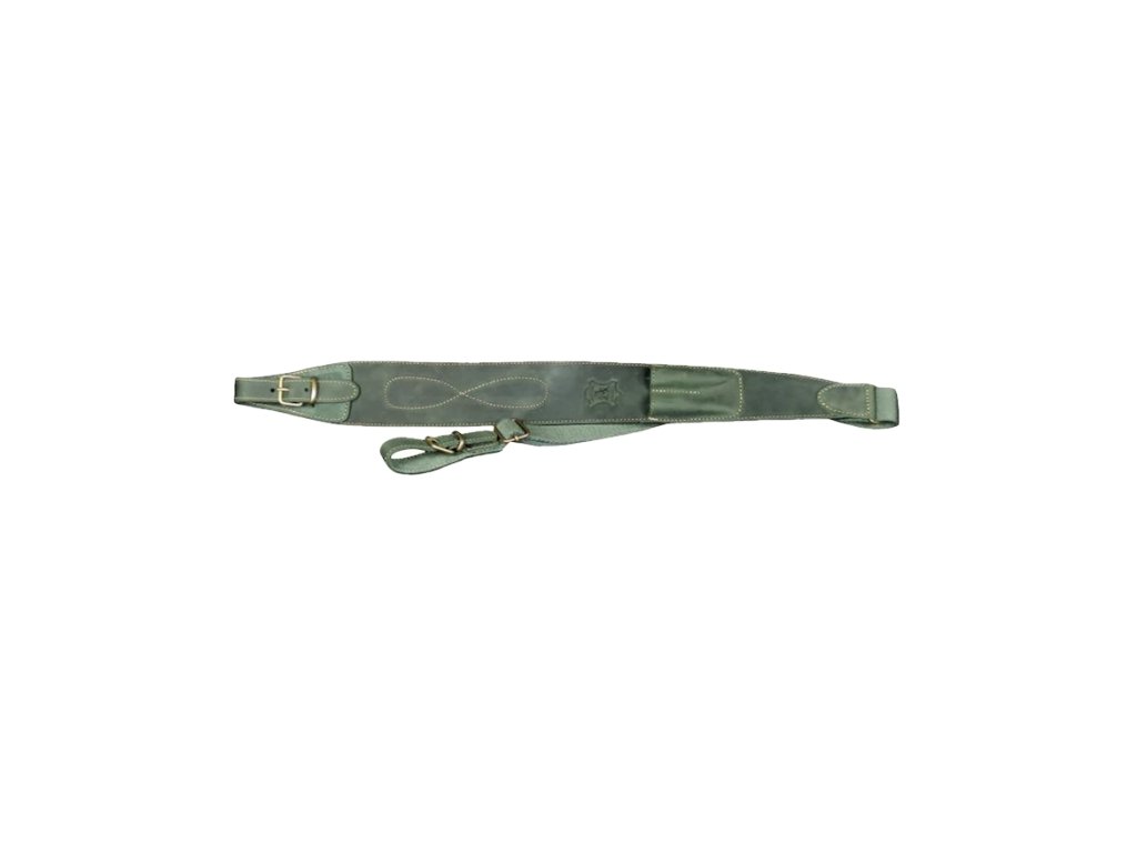 Řemen s voděodolnou úpravou, v zelené kůži. Podšitý velurem, s prostorem na dva myslivecké komponenty. Ručně přišitá poutka s přezkou. Nastavitelnost délky 93–115 cm. Nastavovací část je z nylonu v kombinaci s bavlnou.