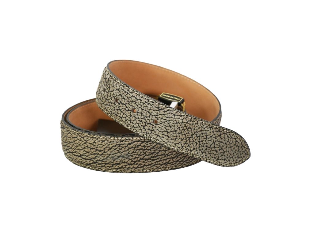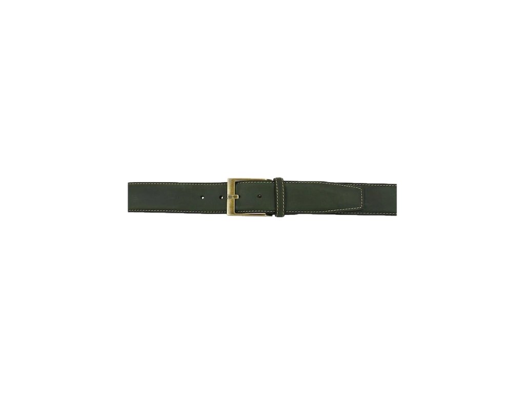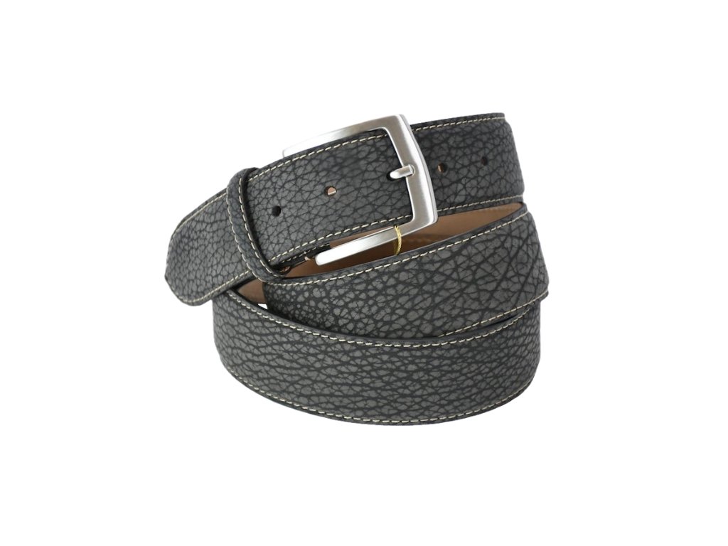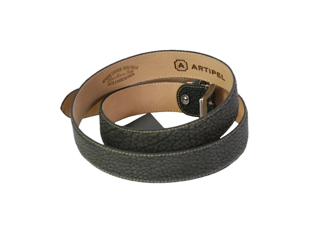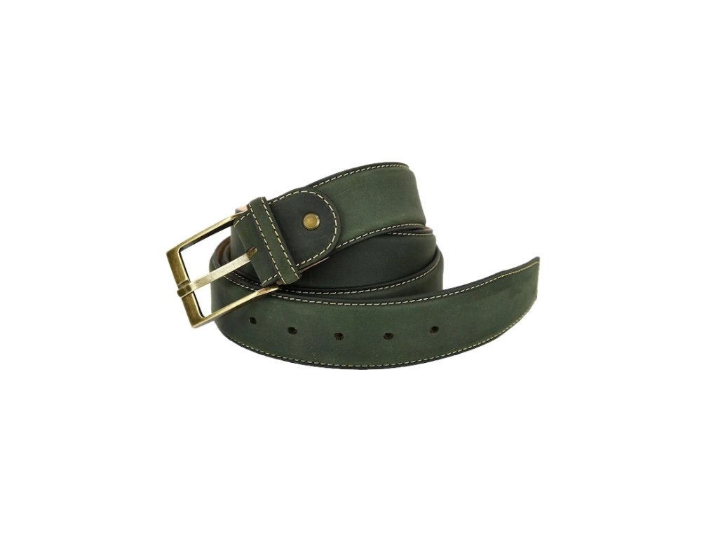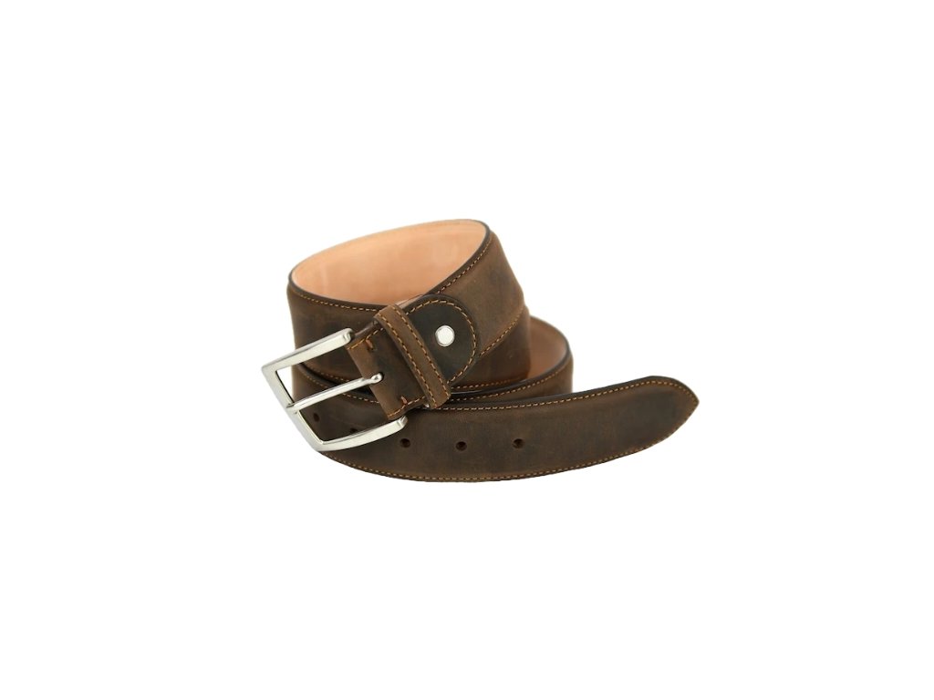 Kožený pas, ručně dokončený, kožené podšití. Masivní niklovaná přezka. Zaoblené, prošité okraje.