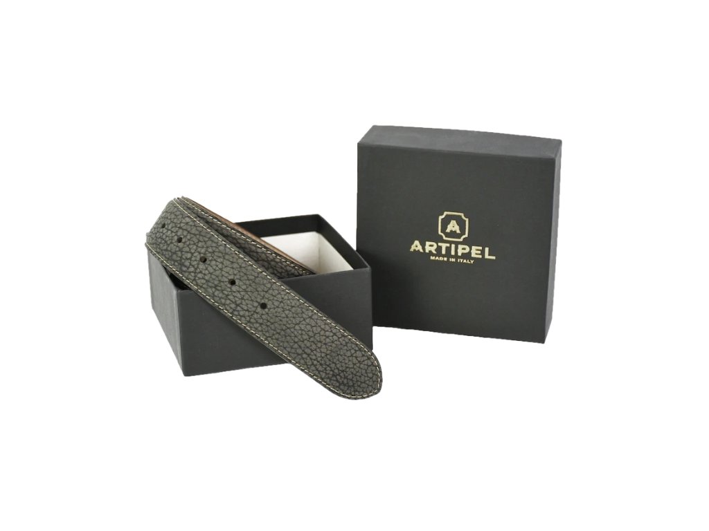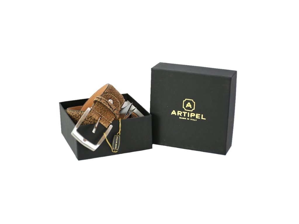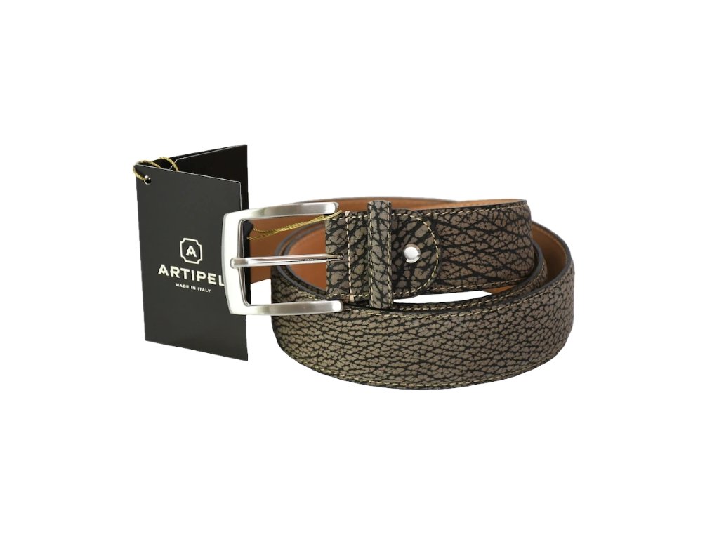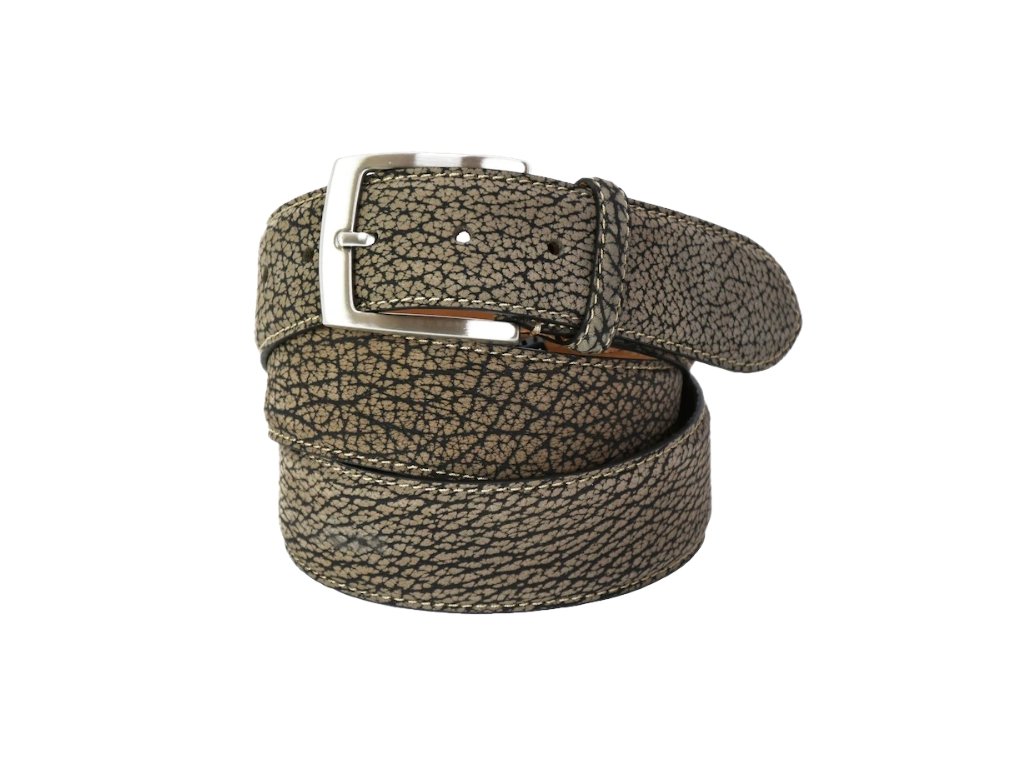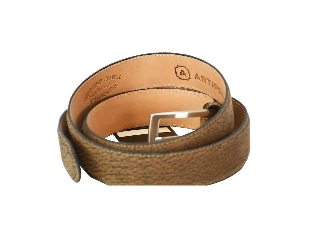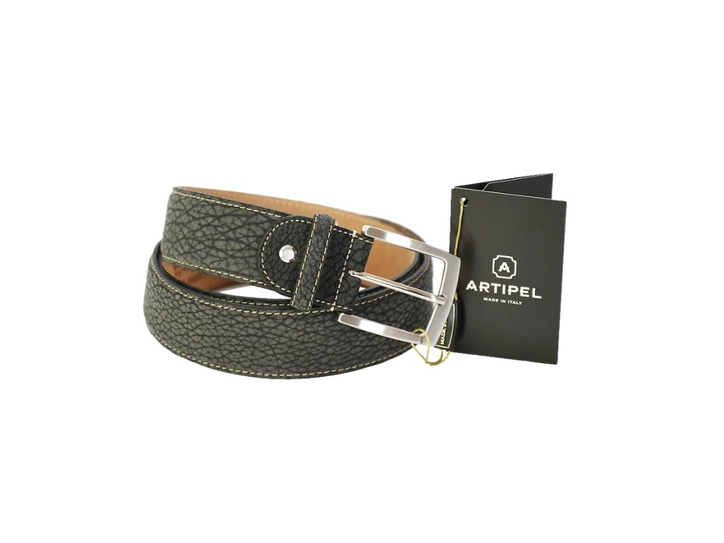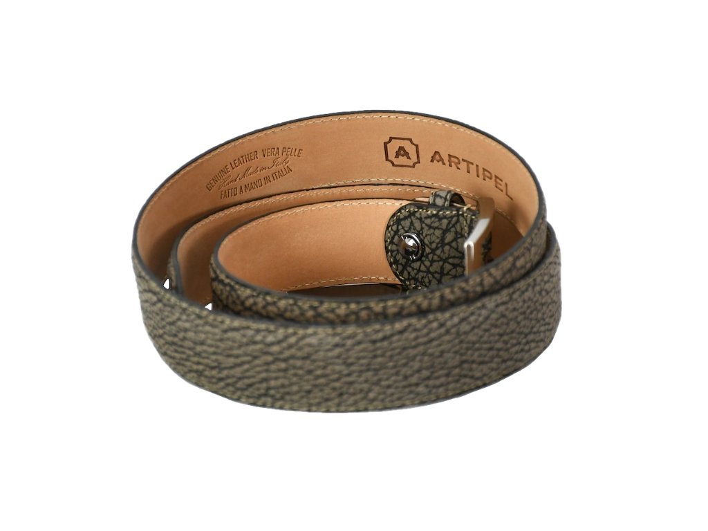 Kožený pas, ručně dokončený, kožené podšití. Masivní niklovaná přezka. Zaoblené, prošité okraje.