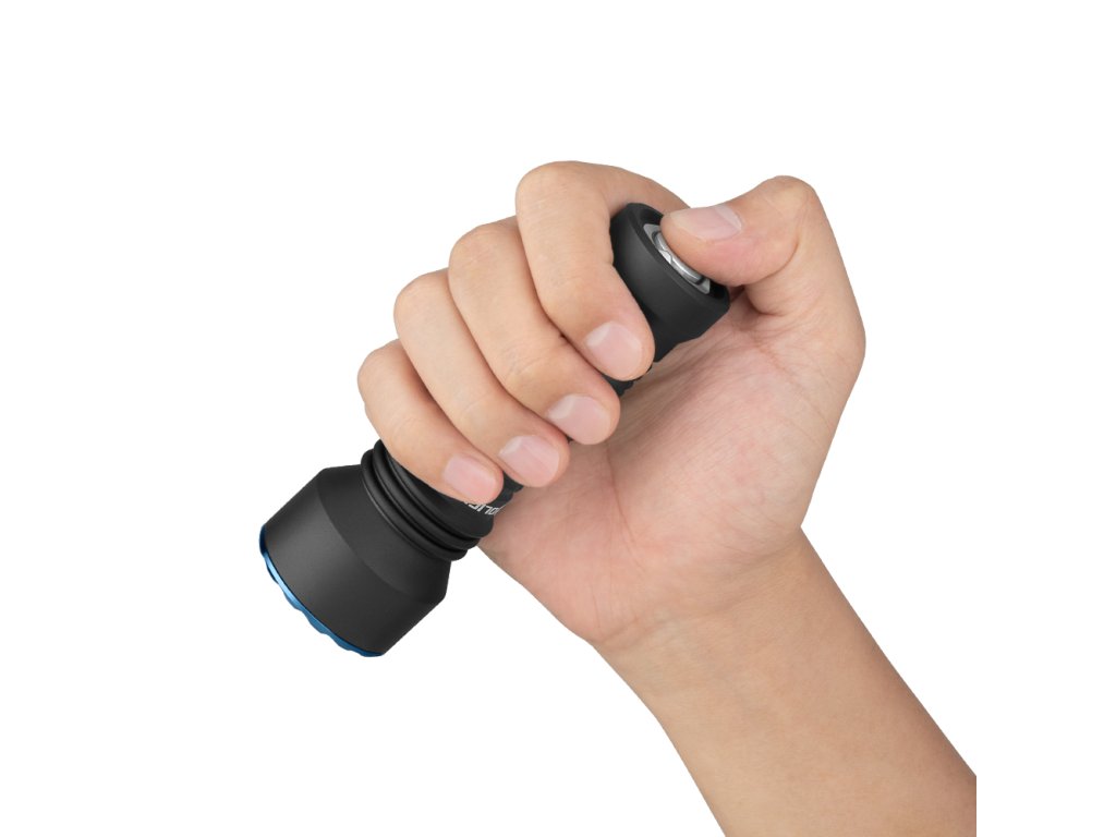 Tělo baterky je vyrobeno z leteckého hliníku pokrytého tvrdou anodizací v černé barvě. Tvarovaná rukojeť poskytuje pohodlnější a stabilnější úchop. Kryt na světlo oceníte při přenášení. Baterka splňuje standard IPX8 a je odolná proti nepřetržitému ponoření do hloubky 1,5m.