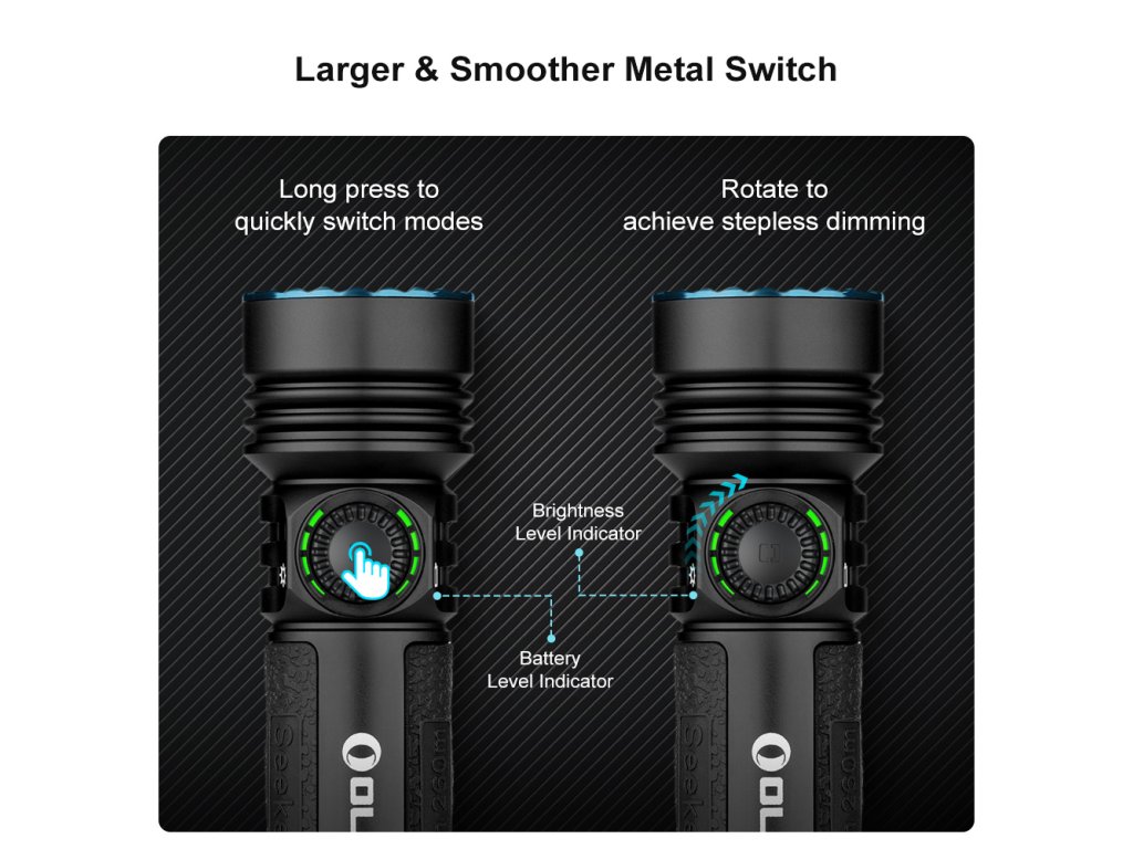 Baterka disponuje novým otočným přepínačem režimů. Umožňuje maximálně plynulé nastavování mezi jednotlivými úrovněmi. Kolem přepínače jsou umístěny světelné indikátory, které ukazují jas a reálnou úroveň nabití baterie.