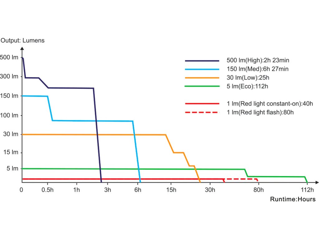 • Čtyři režimy bílého světla: 500 lumenů (2,4 hodiny) -> 150 lumenů (6,5 hodiny) -> 30 lumenů (25 hodin) -> 5 lumenů (112 hodin)