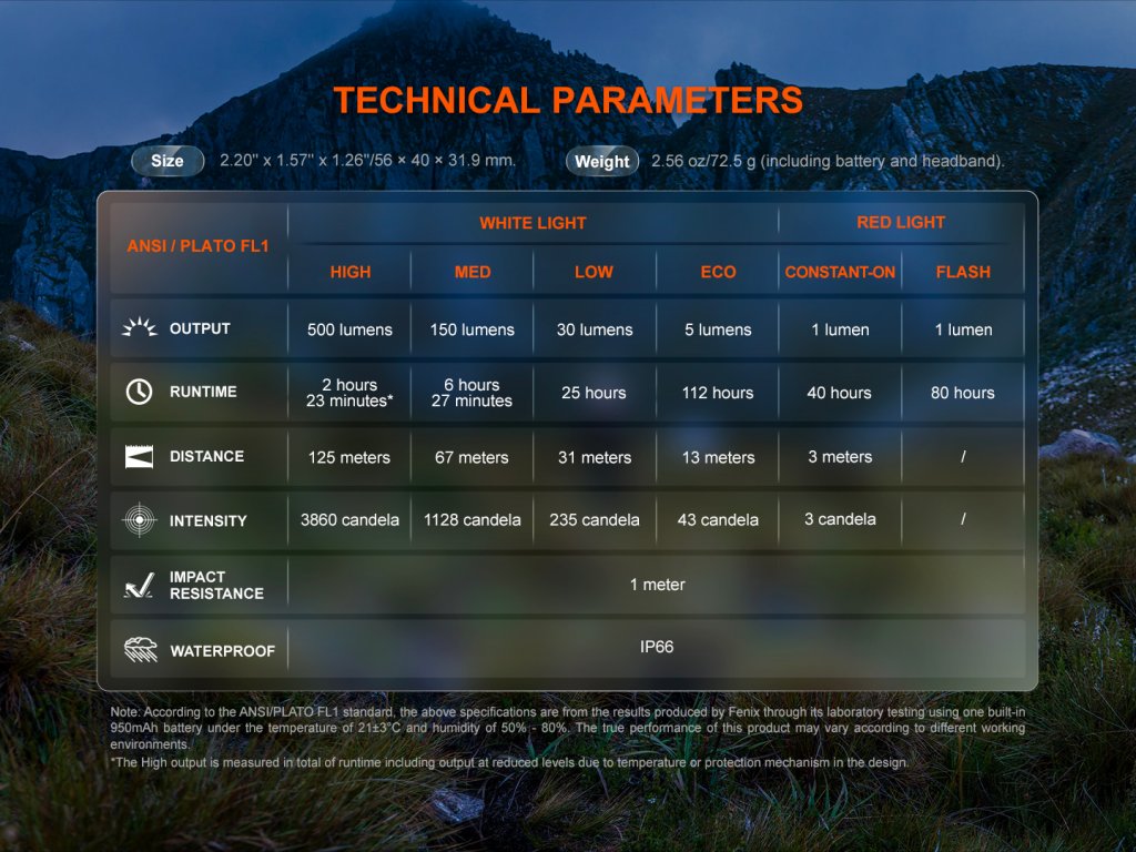 Všechny parametry čelovky (světelný tok, doba provozu na baterie, vodotěsnost, dosvit a nárazuvzdornost) jsou změřeny v souladu s normou ANSI/NEMA FL 1-2009.