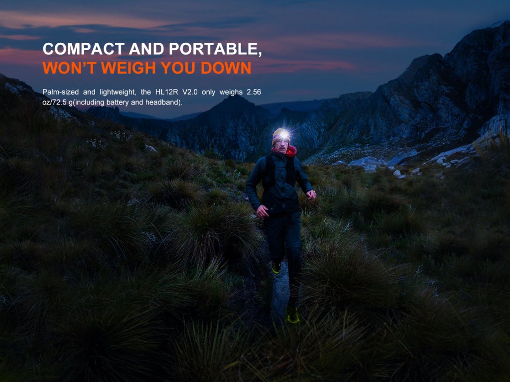Ultralehká a výkonná nabíjecí čelovka Fenix HL12R V2.0 vás potěší světelným tokem až 500 lumenů a dosvitem 125 metrů. I přes hmotnost necelých 73 gramů skrývá integrovaný 950 mAh akumulátor s pohodlným USB-C nabíjením přímo v těle svítilny. Zdrojem světla je moderní LED Luminus SST-20 s chladnějším odstínem světla (denní bílá) a jedna červená LED.