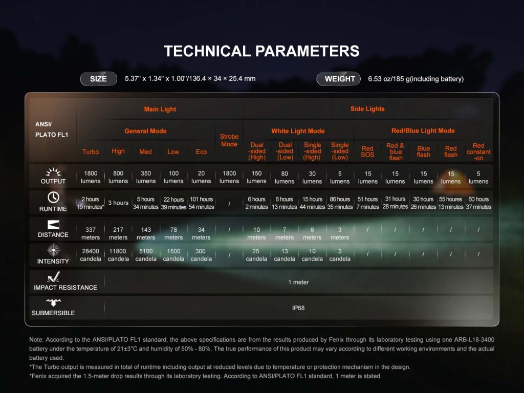 Všechny parametry svítilny (světelný tok, doba provozu na baterie, vodotěsnost, dosvit a nárazuvzdornost) jsou změřeny v souladu s normou ANSI/NEMA FL 1-2009.