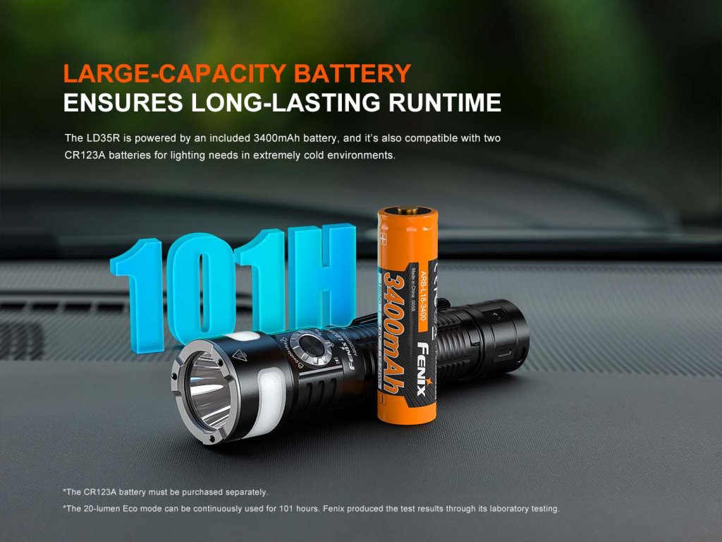 - K napájení používá jeden nabíjecí vysokokapacitní Li-ion akumulátor Fenix ARB-L18-3400, který je součástí balení. V nouzi lze použít i dvě jednorázové 3 V CR123A baterie, ale maximální výkon bude snížený na 800 lm.