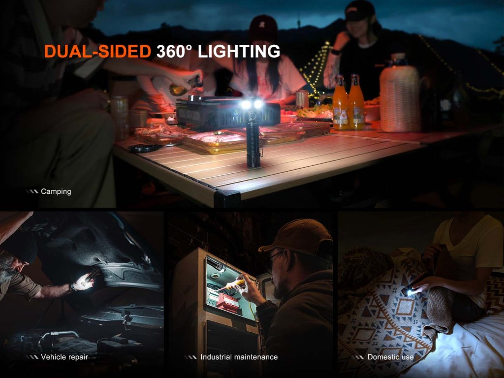 Fenix LD35R je všestranná svítilna vybavená hned třemi typy světla: bílým, červeným a modrým světlem pro širokou škálu scénářů. Hlavní bílé světlo zajišťuje špičková dioda Luminus SST-40 druhé generace s maximálním výkonem 1800 lumenů a působivým dosvitem až 337 metrů, takže tma už nikdy nebude překážkou. Pro flexibilní osvětlení pracovního prostoru nebo okolí je svítilna osazena dvěma výkonnými COB světelnými pásky na boku, které umožňují jak jednostranné nasvícení, tak i plošné 360° osvětlení. Plochá zadní část ukrývá silný magnet pro přichycení na kovové povrchy, což oceníte při opravách, kempování nebo práci v dílně. Pro krizové situace je svítilna vybavena úderným ráfkem z nerezové oceli, který je osazen keramickými hroty pro rychlé rozbití skla a efektivní sebeobranu. Pohodlné a rychlé ovládání jednou rukou zajišťuje kombinace páčkového a elektronického spínače. O napájení se stará přiložený akumulátor typu 18650 s kapacitou 3400 mAh, který se nabíjí přímo ve svítilně přes vodotěsný USB-C port. Díky své kompaktní velikosti a multifunkčnosti se Fenix LD35R stane vaším schopným pomocníkem pro outdoorové aktivity, práci i nouzové situace.