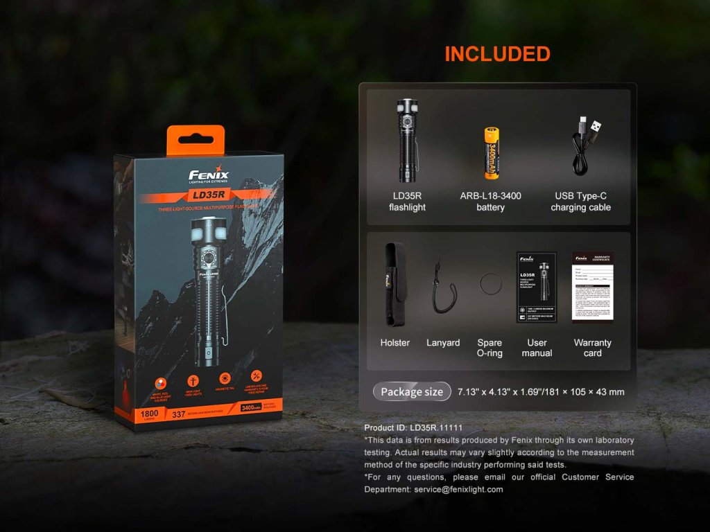 - Ke svítilně je přiložena šňůrka na zápěstí, pouzdro na opasek, náhradní o-kroužek, nabíjecí USB-C kabel, akumulátor Fenix ARB-L18-3400.