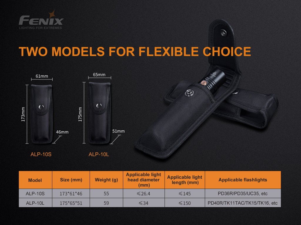 - ALP-10S lze použít například na svítidla Fenix E-CP, E28R, PD32 V2.0, PD35, PD35 TAC, PD36R, PD36 TAC, PD36R PRO, UC30, UC35, FD30.