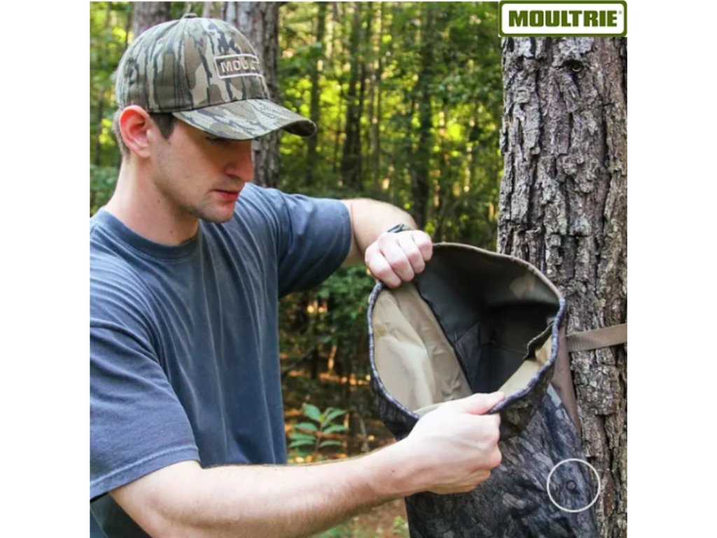 Zásobník je vyroben z odolné, voděodolné tkaniny ve vzoru Moultrie Pine Bark™ camo , která dokonale splývá s přírodním prostředím. Díky paměťovému drátu v horním otvoru je plnění zásobníku velmi jednoduché – po naplnění se otvor automaticky uzavře a udrží krmivo suché a chráněné před deštěm.
