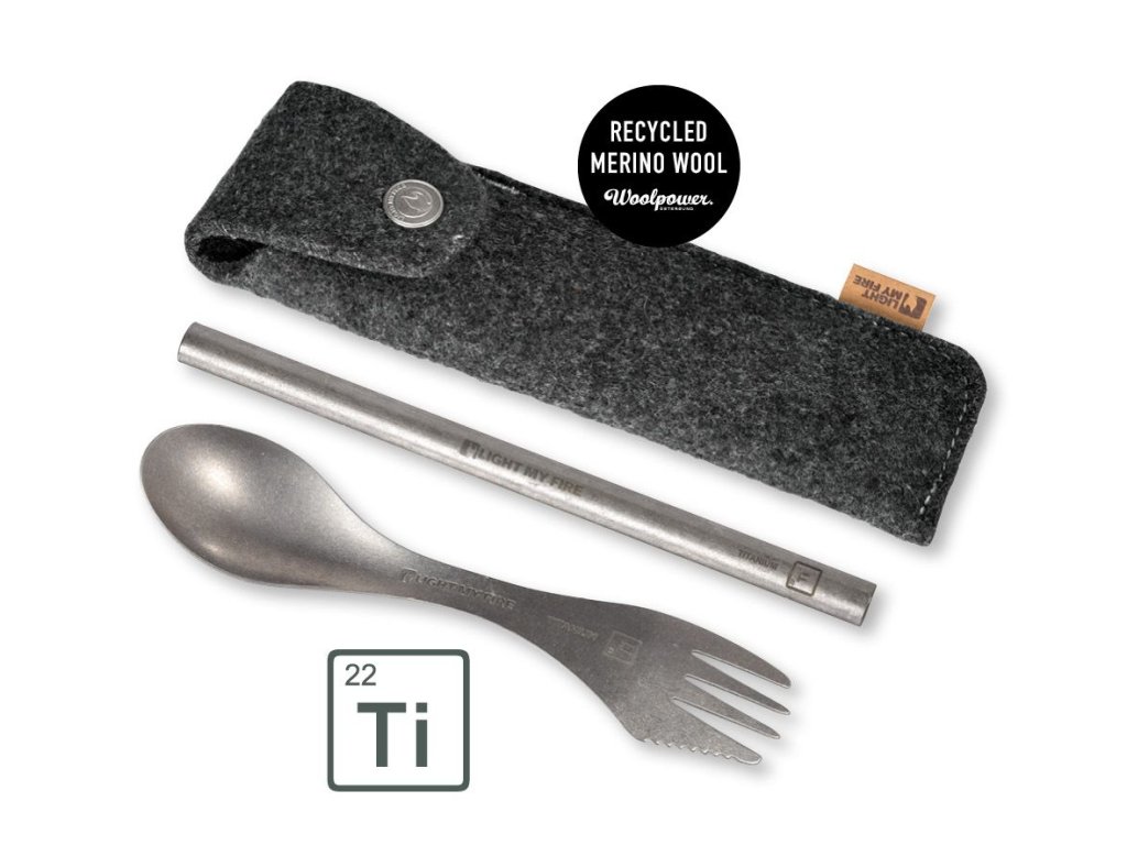Sada titanové brčka a titanového příboru Spork Titanium, který kombinuje v jednom nástroji lžíci, vidličku i nůž. Ať už vyrážíte na chatu nebo do Himálaje, tak vám tento nerozbitný nástroj skvěle poslouží a ušetří prostor i hmotnost při všech vašich outdoorových dobrodružstvích. Spork i brčka jsou vyrobeny z lehké a extrémně pevné titanové slitiny. Použitý materiál nekoroduje, je hypoalergenní a lze jej mýt v myčce. Součástí balení je také praktické pouzdro z recyklované merino vlny.