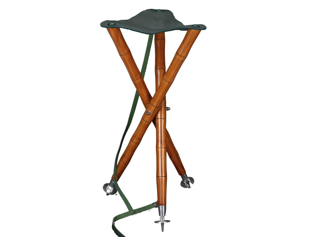 Skládací dřevěná trojnožka s hliníkovými hroty se sklopnými opěrnými deskami. Nosný popruh a sedací část z robustní zelené nubukové kůže. Vyraženo logo DJV na přibl. 35 cm velké sedací ploše, výška přibl. 71 cm. Hmotnost 1870g.