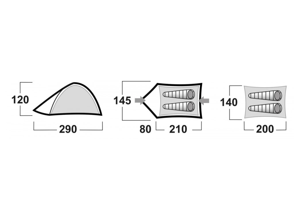| Hmotnost min./celková | : 3,2 kg / 3,6 kg Konstrukce: dvouplášťový samonosný stan s vnitřní konstrukcí |