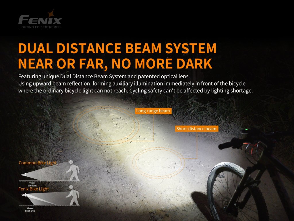 Druhá generace extrémně výkonného světla na kolo Fenix BC30 V2.0 přináší světelný tok až 2200 lumenů (ANSI). K napájení lze použít dvojici nabíjetelných Li-ion akumulátorů 18650 s vystouplým plusovým pólem (18650 bez vystouplého plusového pólu ve svítidle mají nedostatečný kontakt), případně čtyři jednorázové baterie CR123A. Světelným zdrojem jsou dvě moderní LED Luminus SST-40 . Svítilna používá osvědčenou technologii dvojitého směrování světla "Dual Distance Beam System". Hlavní kužel světla je vytvářen speciálně navrženou optikou a dosvítí až do vzdálenosti 187 metrů , zatímco sekundární široký kužel paprsků dotváří optický člen, který je v horní části tvarován tak, že světlo směřující nahoru láme dolů na zem. Vzniká tím kužel plynule osvětlující celý prostor před kolem – a to iv místech, která běžná cyklistická světla nepokryjí. Oproti minulé generaci je cyklosvětlo vybaveno bezdrátovým dálkovým ovládáním , kterým lze měnit režimy svícení či aktivovat Burst režim. Design držáku umožňuje rychlou montáž i demontáž světla na řídítka bez použití nářadí, držák navíc umožňuje rychlé vyjmutí svítidla, takže jej lze použít také jako vysoce výkonné ruční světlo. Držák lze použít na všechna řídítka o průměru od 22 až do 32 milimetrů. K dispozici je celkem šest digitálně regulovaných režimů výkonu včetně varovného blikání, nechybí ani upozornění na vybité baterie. Cyklosvětlo Fenix BC30 V2.0 vám zajistí kvalitní osvětlení na noční tréninky, pravidelné dojíždění do práce i na 24hodinové závody.
