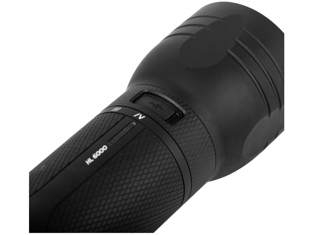 Indikátor nabíjení na boku ukazuje stav nabití baterie. Baterka má tři nabíjecí baterie 21700, které lze dobíjet přes integrovaný port USB-C. Pokud jsou jedna nebo dvě baterie vybité nebo byly vyjmuty, HL6000 bude nadále pracovat na nejvyšší úrovni.