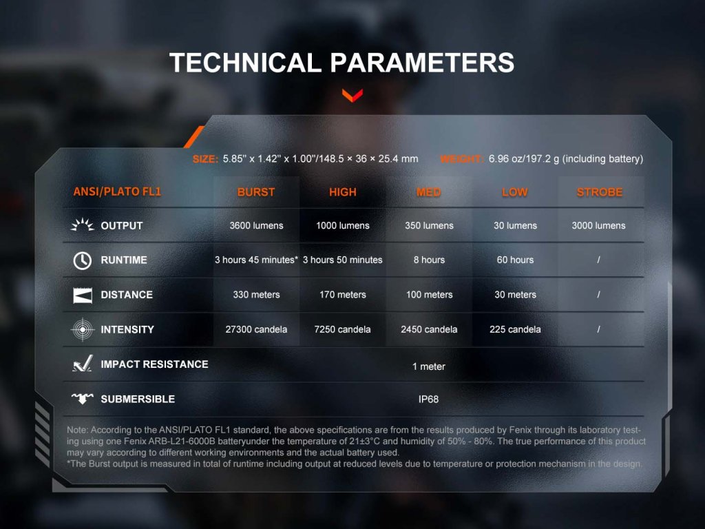 - Jako volitelné příslušenství lze dokoupit: taktický kroužek Fenix ALR-01, kabelový spínač AER-05 a AER-04 (bez stroboskopu, maximální výkon je omezen na 1200 lm), bílý difuzér AOD-M, bílý a červený dopravní kužel AOT-04.
